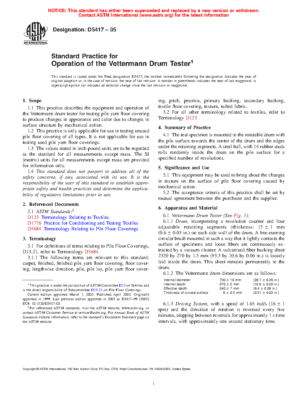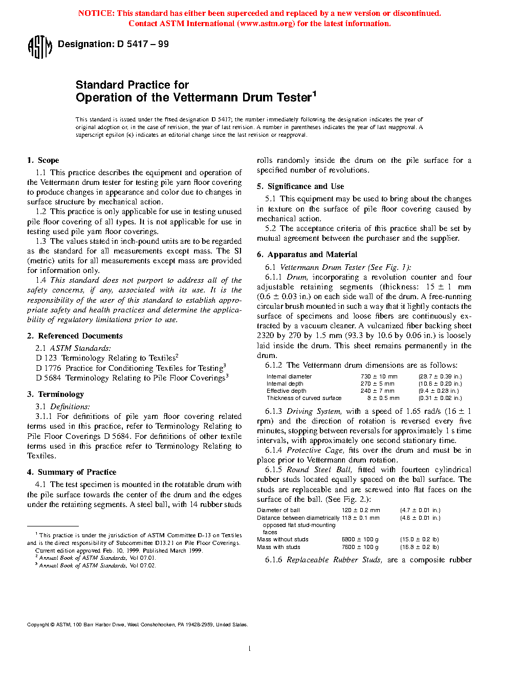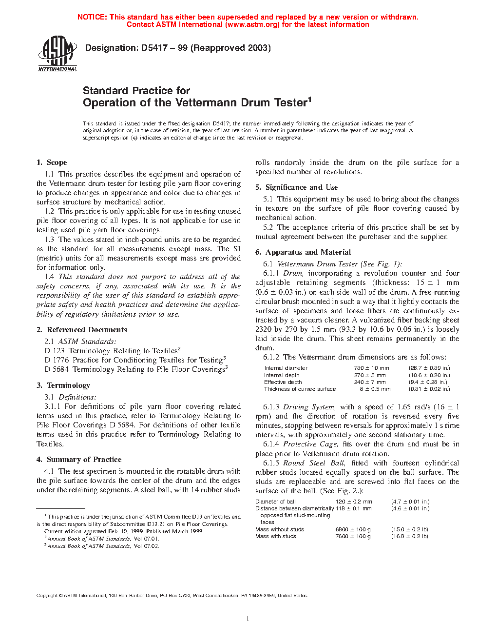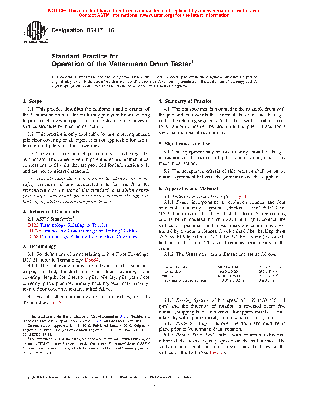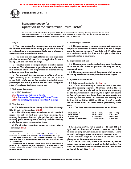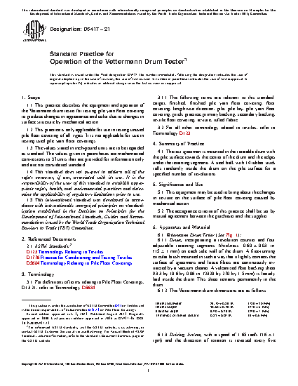 1.1 This practice describes the equipment and operation of the Vettermann drum tester for testing pile yarn floor covering to produce changes in appearance and color due to changes in surface structure by mechanical action.