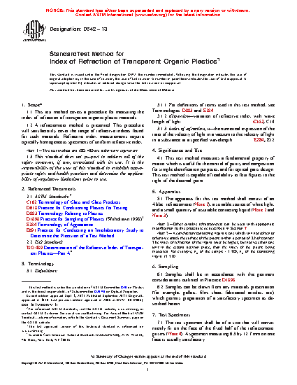1.2 A refractometer method is presented. This procedure will satisfactorily cover the range of refractive indices found for such materials. Refractive index measurements require optically homogeneous specimens of uniform refractive index.