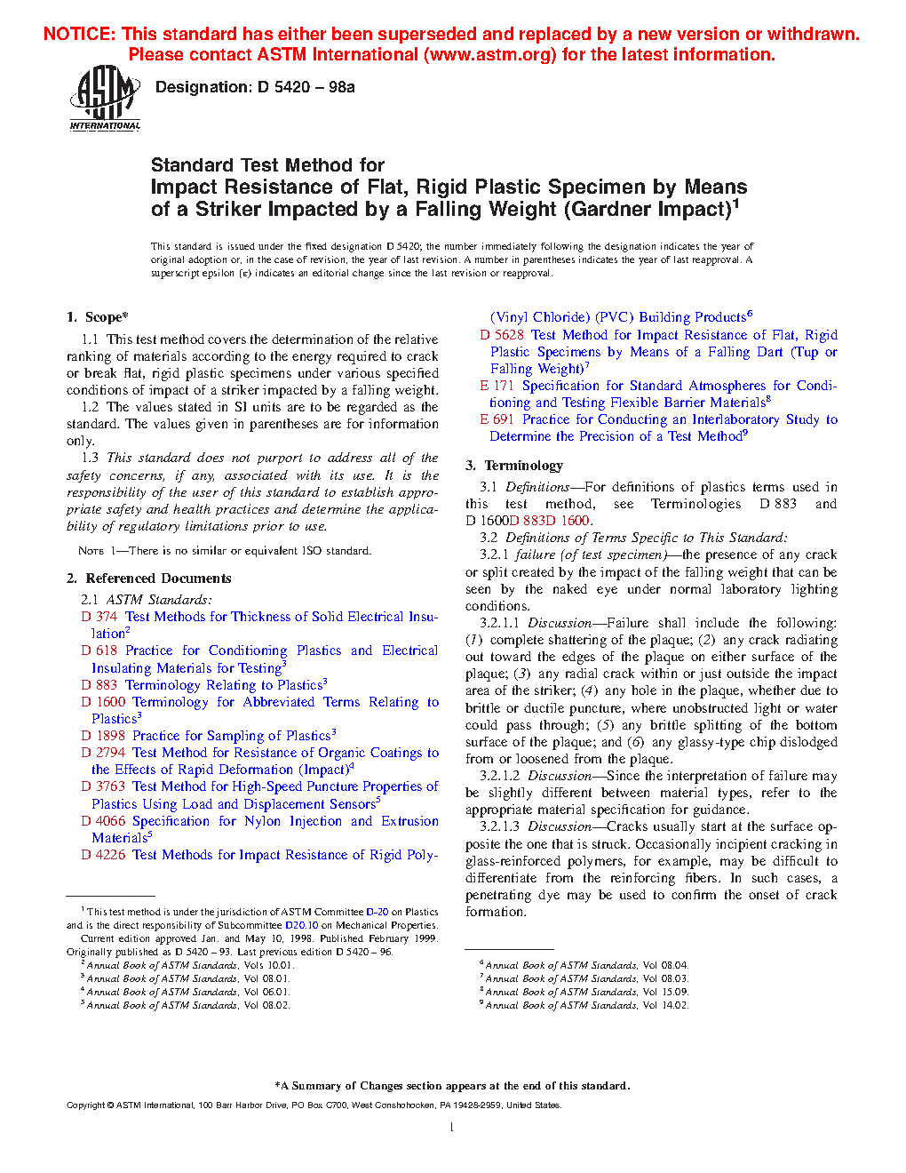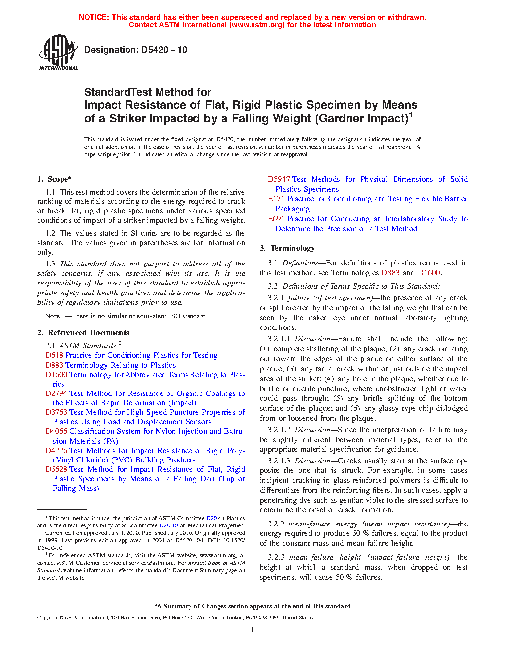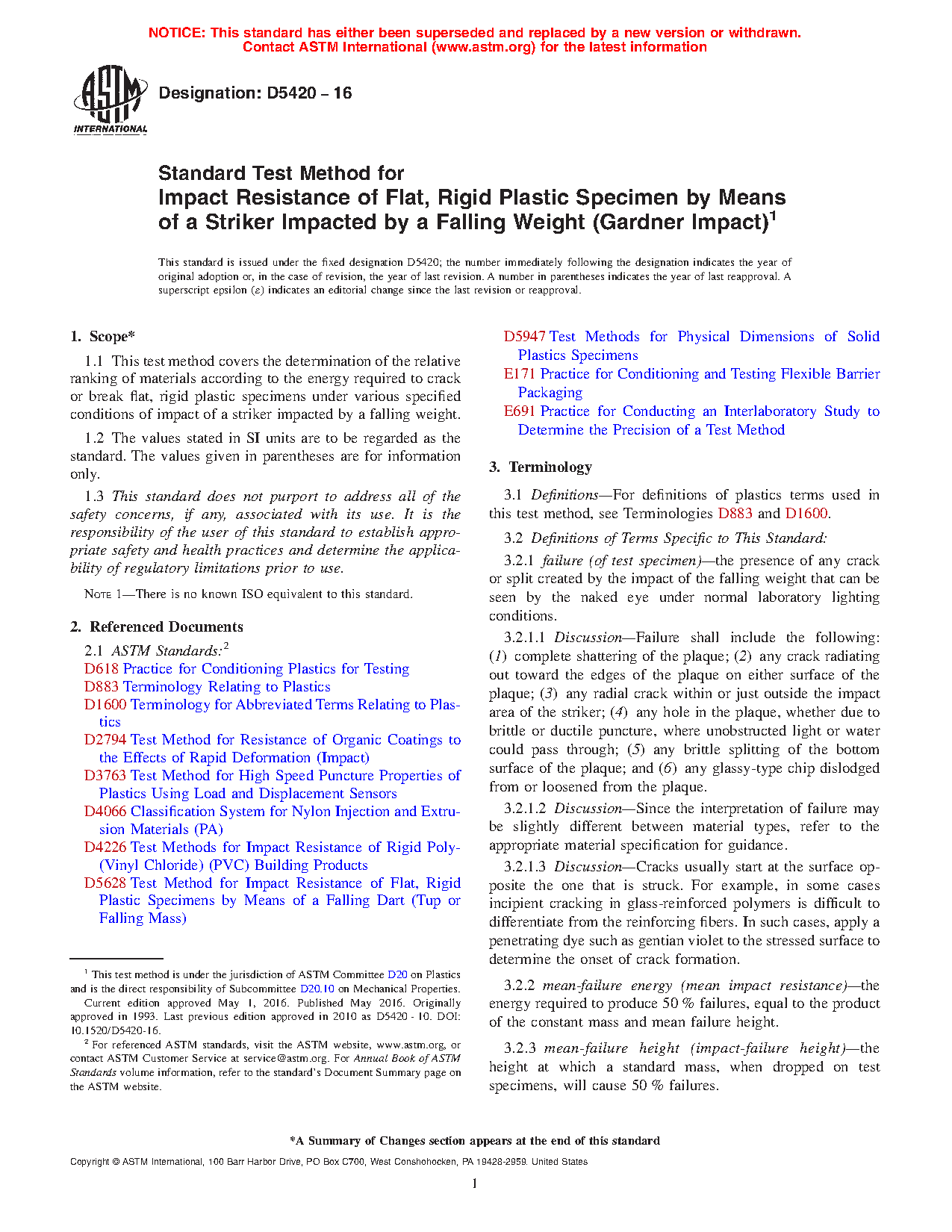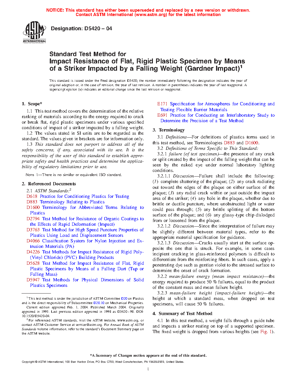 1.1 This test method covers the determination of the relative ranking of materials according to the energy required to crack or break flat, rigid plastic specimens under various specified conditions of impact of a striker impacted by a falling weight.