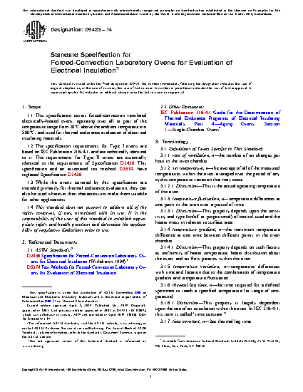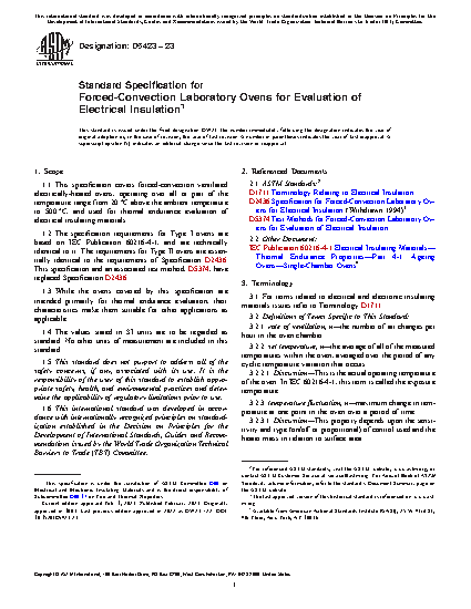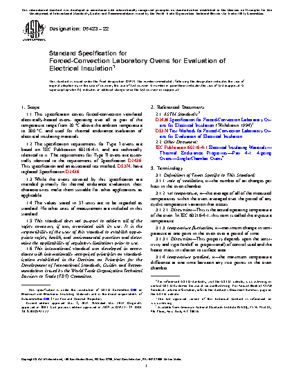 1.1 This specification covers forced-convection ventilated electrically-heated ovens, operating over all or part of the temperature range from 20°C above the ambient temperature to 500°C, and used for thermal endurance evaluation of electrical insulating materials.