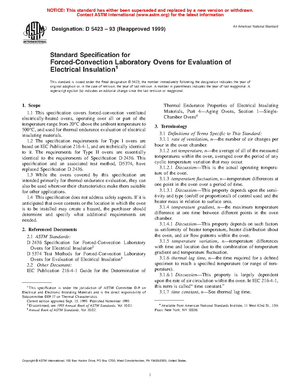 1.2 The specification requirements for Type I ovens are based on IEC Publication 216-4-1, and are technically identical to it. The requirements for Type II ovens are essentially identical to the requirements of Specification D2436. This specification and an associated test method, D5374, have replaced Specification D2436.