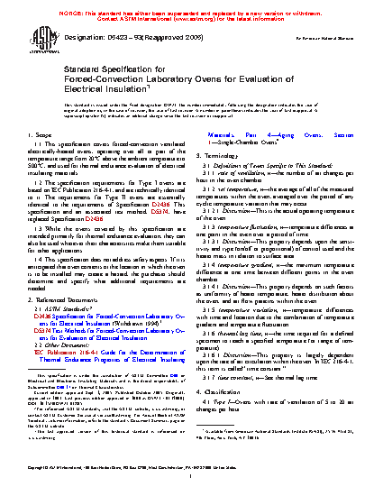 1.1 This specification covers forced-convection ventilated electrically-heated ovens, operating over all or part of the temperature range from 20 °C above the ambient temperature to 500 °C, and used for thermal endurance evaluation of electrical insulating materials.
