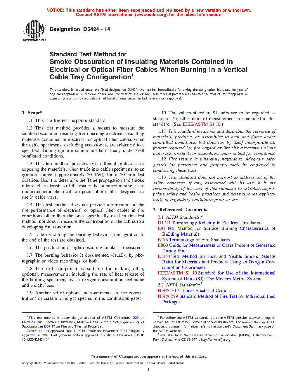 This test method provides a means to measure a variety of fire-test-response characteristics associated with smoke obscuration and resulting from burning the electrical insulating materials contained in electrical or optical fiber cables. The specimens are allowed to burn freely under well ventilated conditions after ignition by means of a propane gas burner.