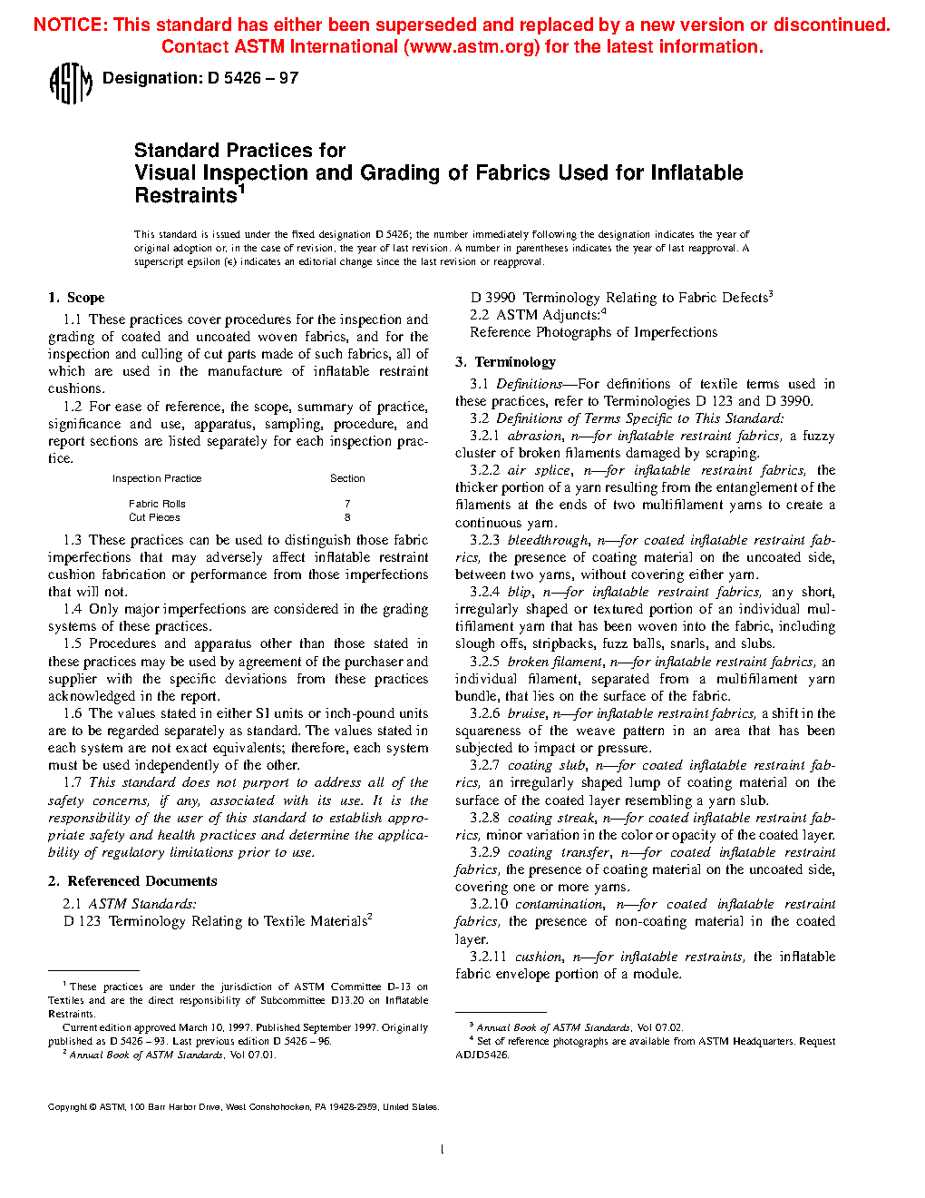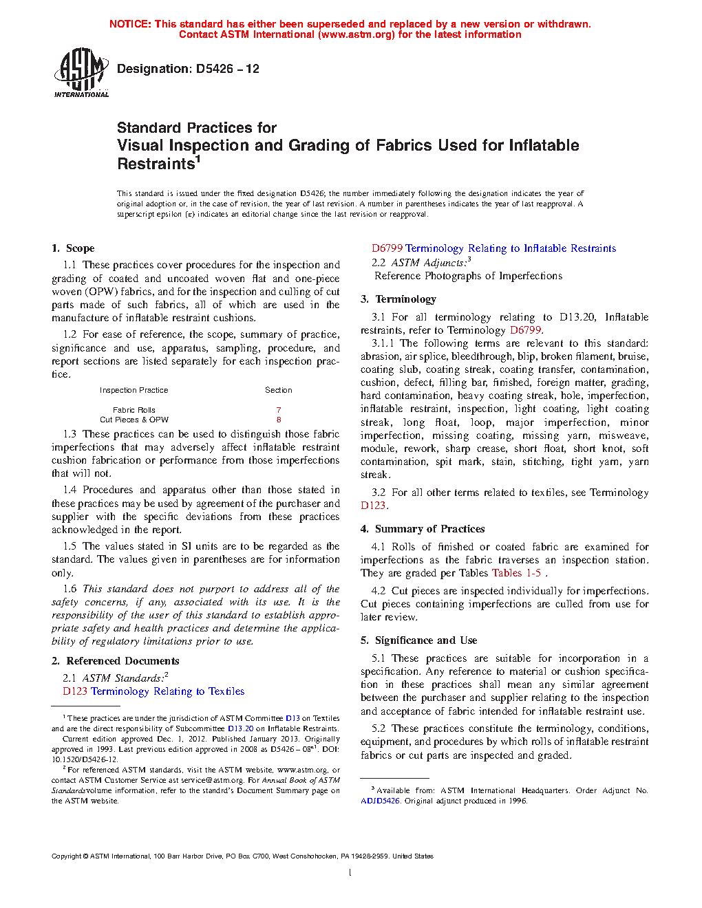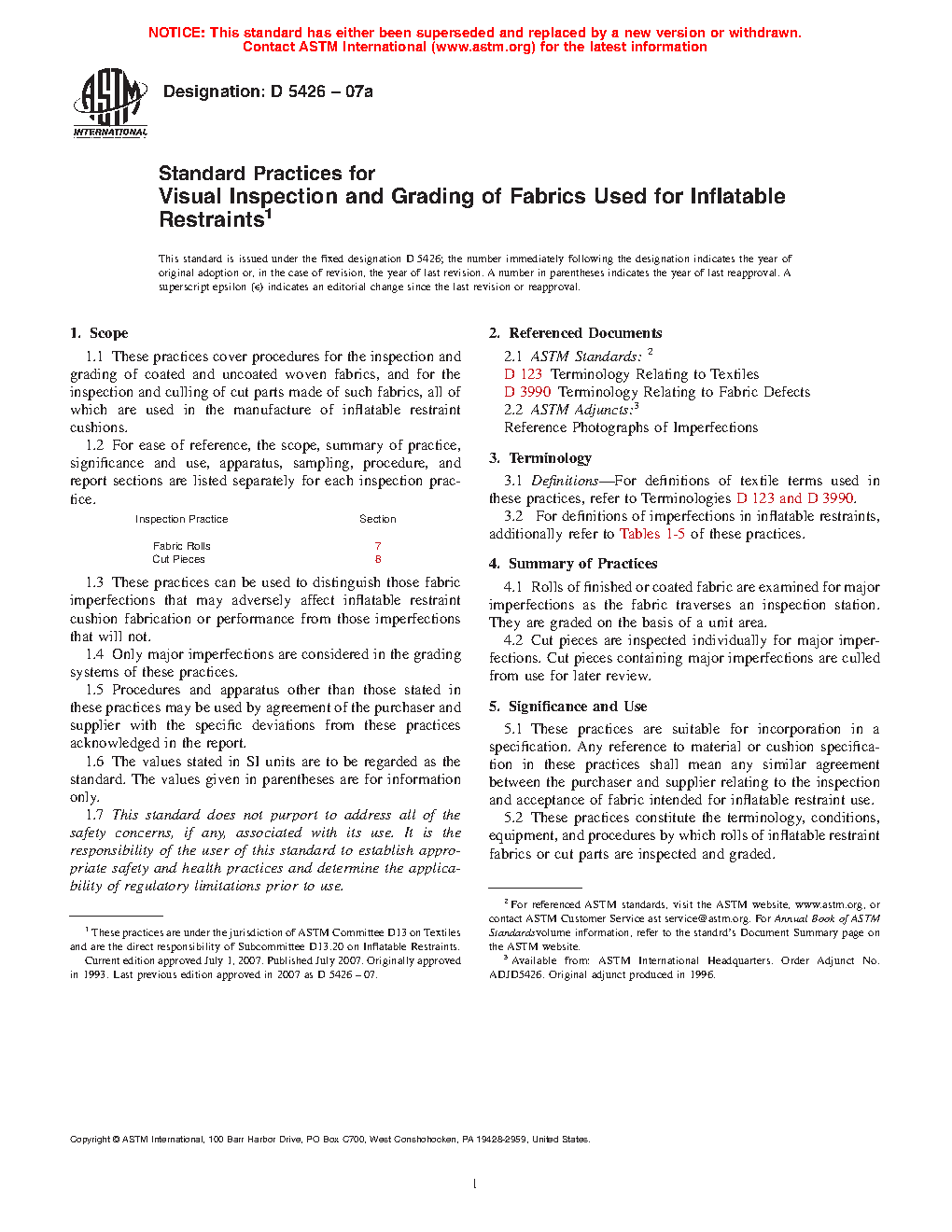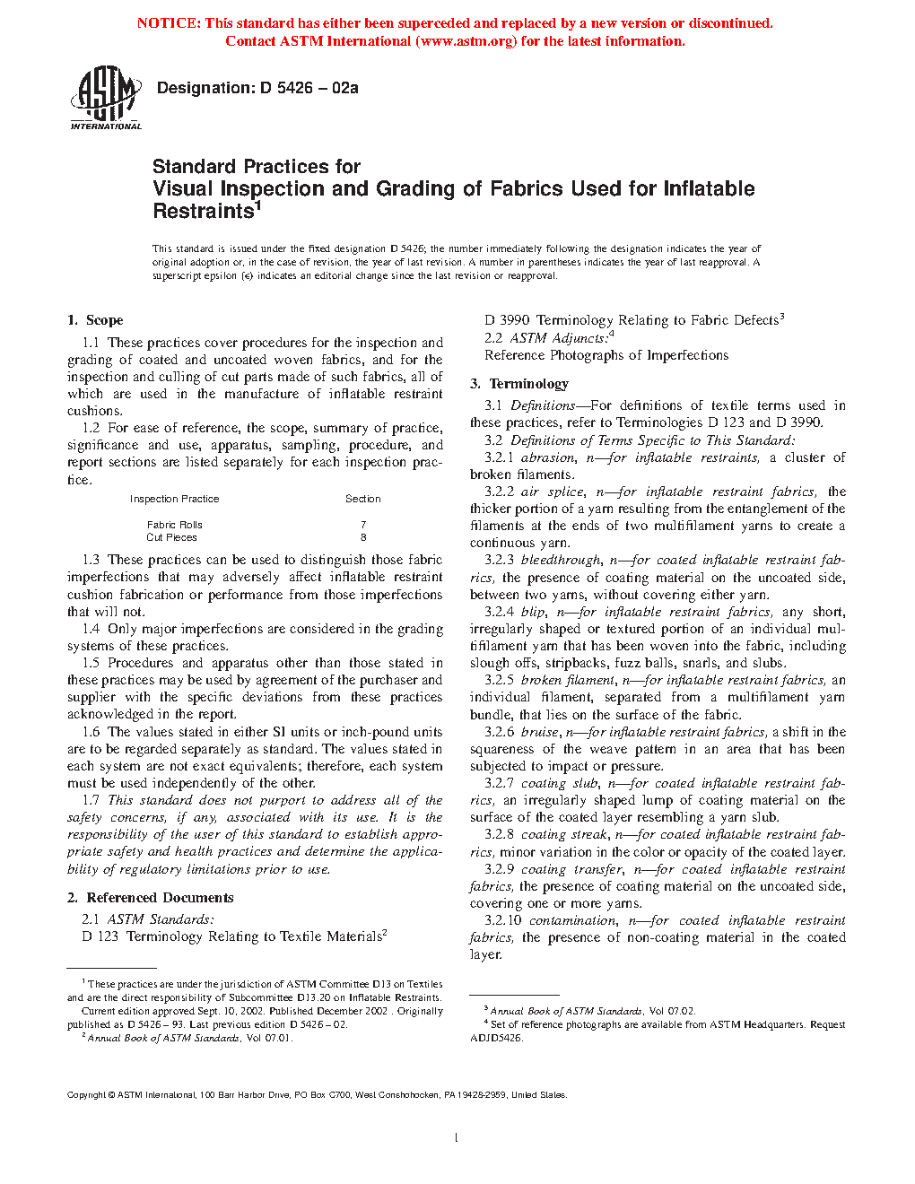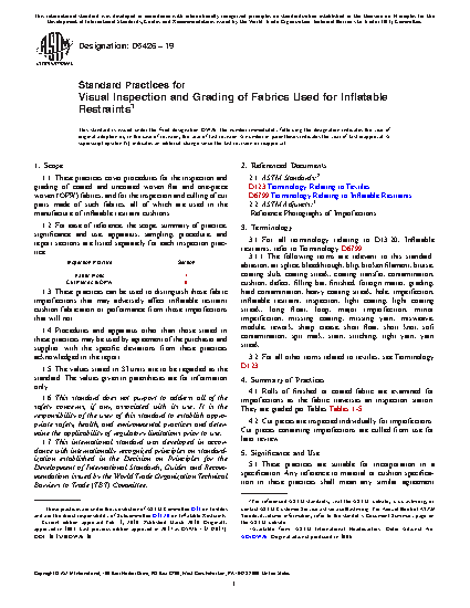 1.1 These practices cover procedures for the inspection and grading of coated and uncoated woven flat and one-piece woven (OPW) fabrics, and for the inspection and culling of cut parts made of such fabrics, all of which are used in the manufacture of inflatable restraint cushions.