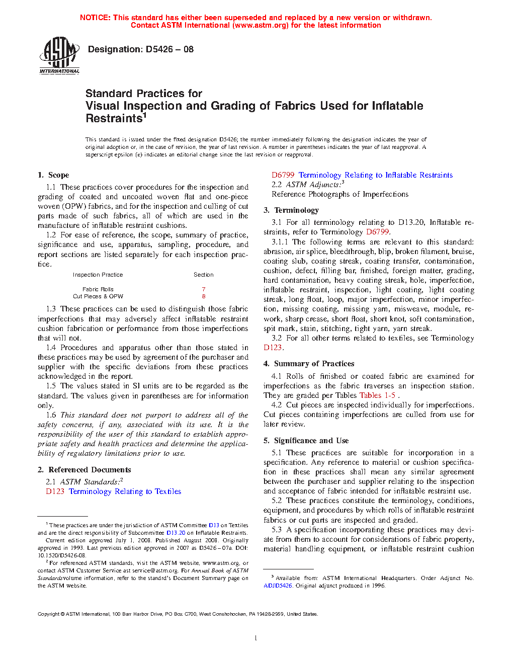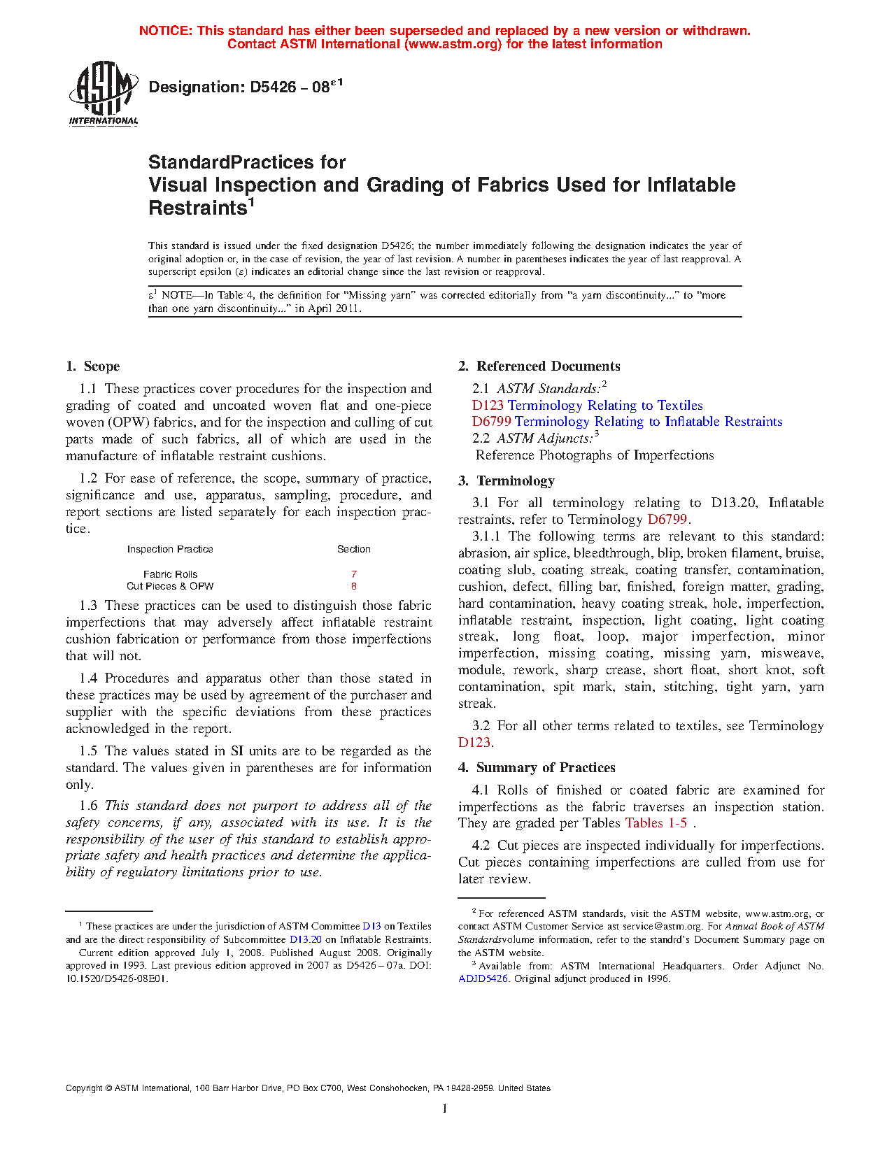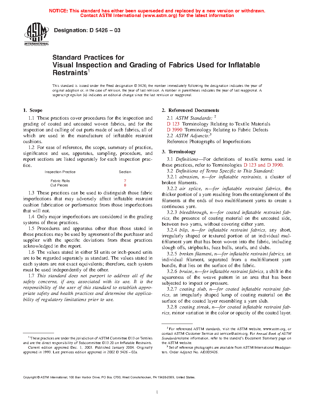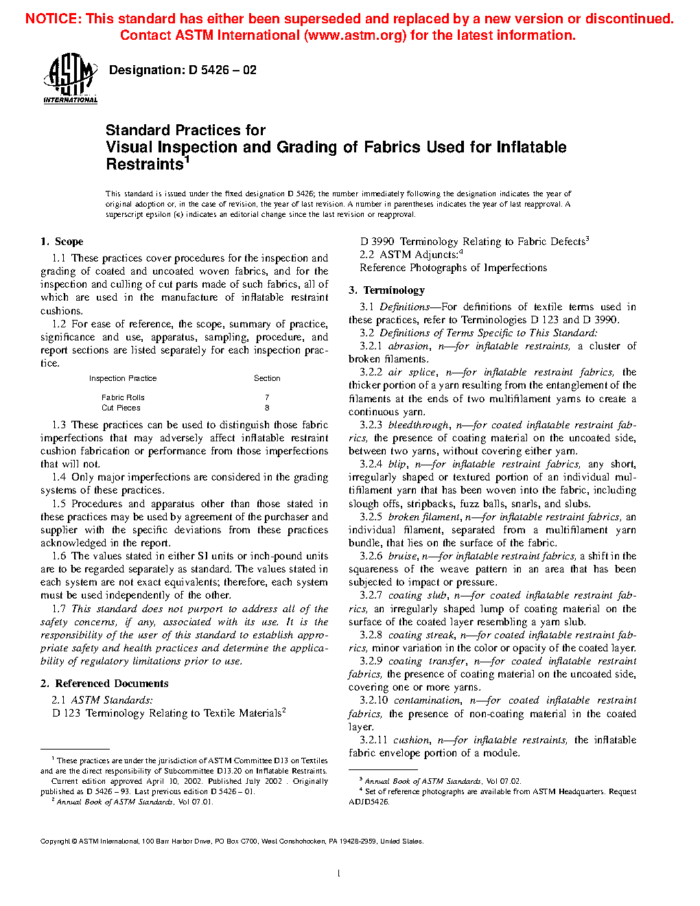 1.1 These practices cover procedures for the inspection and grading of coated and uncoated woven flat and one-piece woven (OPW) fabrics, and for the inspection and culling of cut parts made of such fabrics, all of which are used in the manufacture of inflatable restraint cushions.