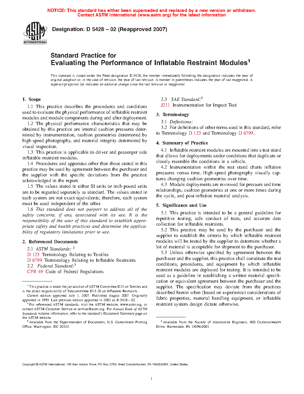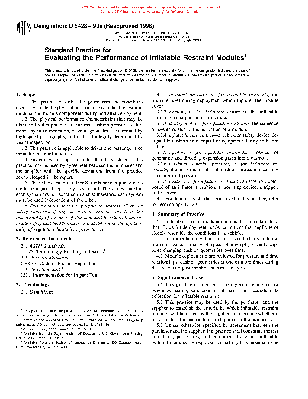 1.1 This practice describes the procedures and conditions used to evaluate the physical performance of inflatable restraint modules and module components during and after deployment.