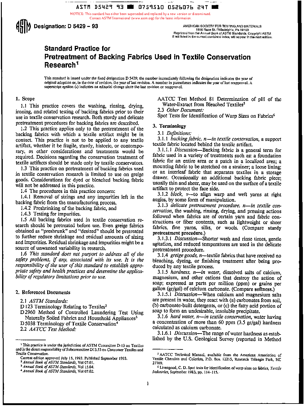 This practice applies only to the pretreatment of the backing fabric by washing, rinsing, drying, and ironing before the backing fabric will be used in textile conservation research. Textile artifacts of historic and artistic value must not be treated using this practice. Decisions regarding the conservation treatment of textile artifacts should be made only by textile conservators.