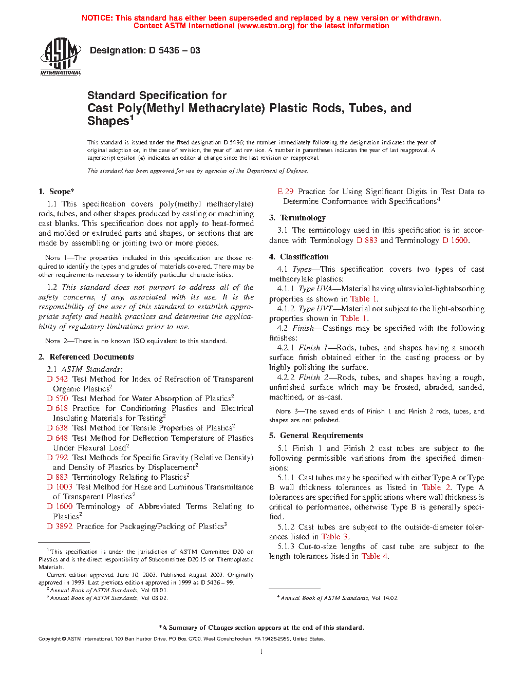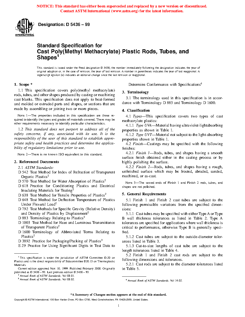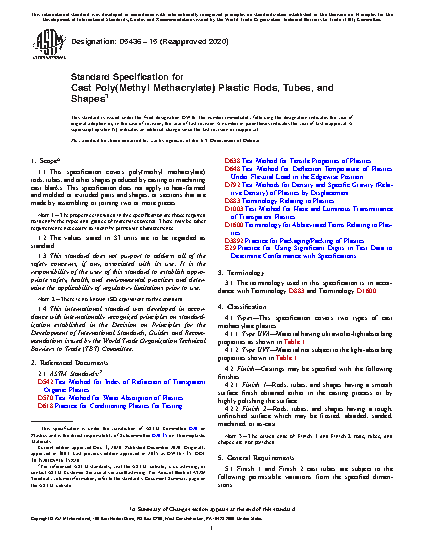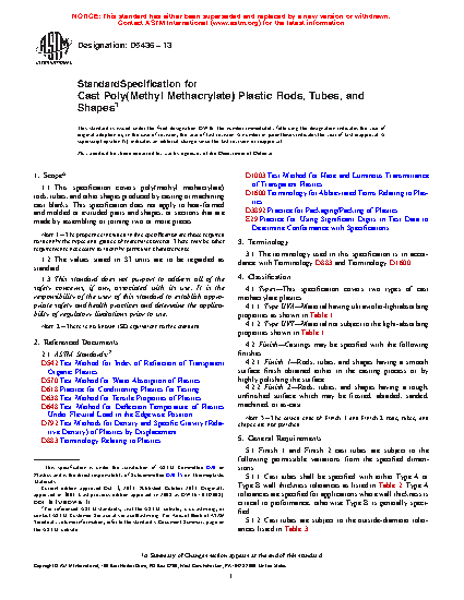 This specification covers poly(methyl mathacrylate) plastic rods, tubes, and other shapes produced by casting or machining cast blanks. It does not however apply to heat-formed and molded or extruded parts and shapes, or sections that are made by assembling or joining two or more pieces. The plastics may be of two types according to the material's ultraviolet light absorbing properties while the castings may be specified according to the surface finishing which may be a smooth surface finish obtained either in the casting process or by surface polishing or a rough, unfinished surface which may be frosted, abraded, sanded, machined, or as-cast. Tests shall be conducted in the standard laboratory atmosphere to determine the physical and optical properties of the materials. The specimens shall conform to the index of refraction, specific gravity, water absorption, deflection temperature under flexural load, tensile strength, elongation at break, spectral transmittance, luminous transmittance, and haze requirements.