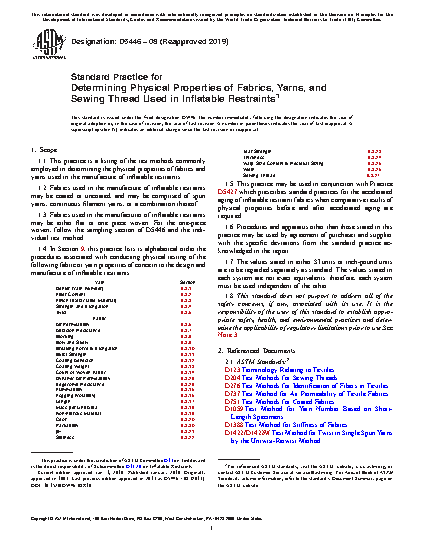 1.4 In Section 9, this practice lists is alphabetical order the procedures associated with conducting physical testing of the following fabric or yarn properties of concern to the design and manufacture of inflatable restraints.
