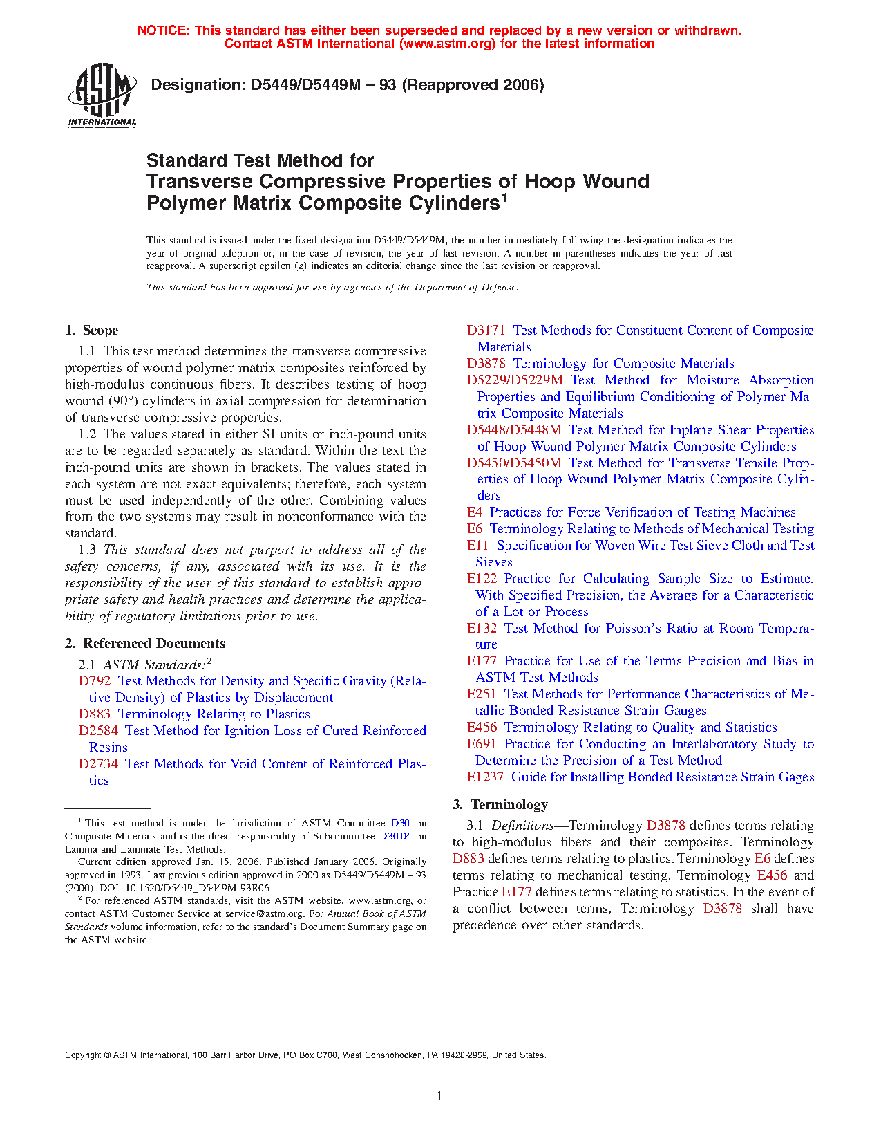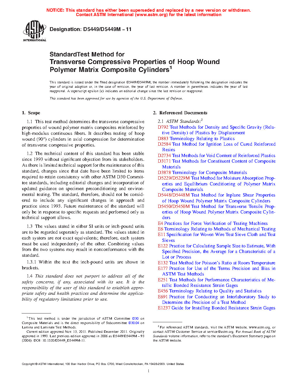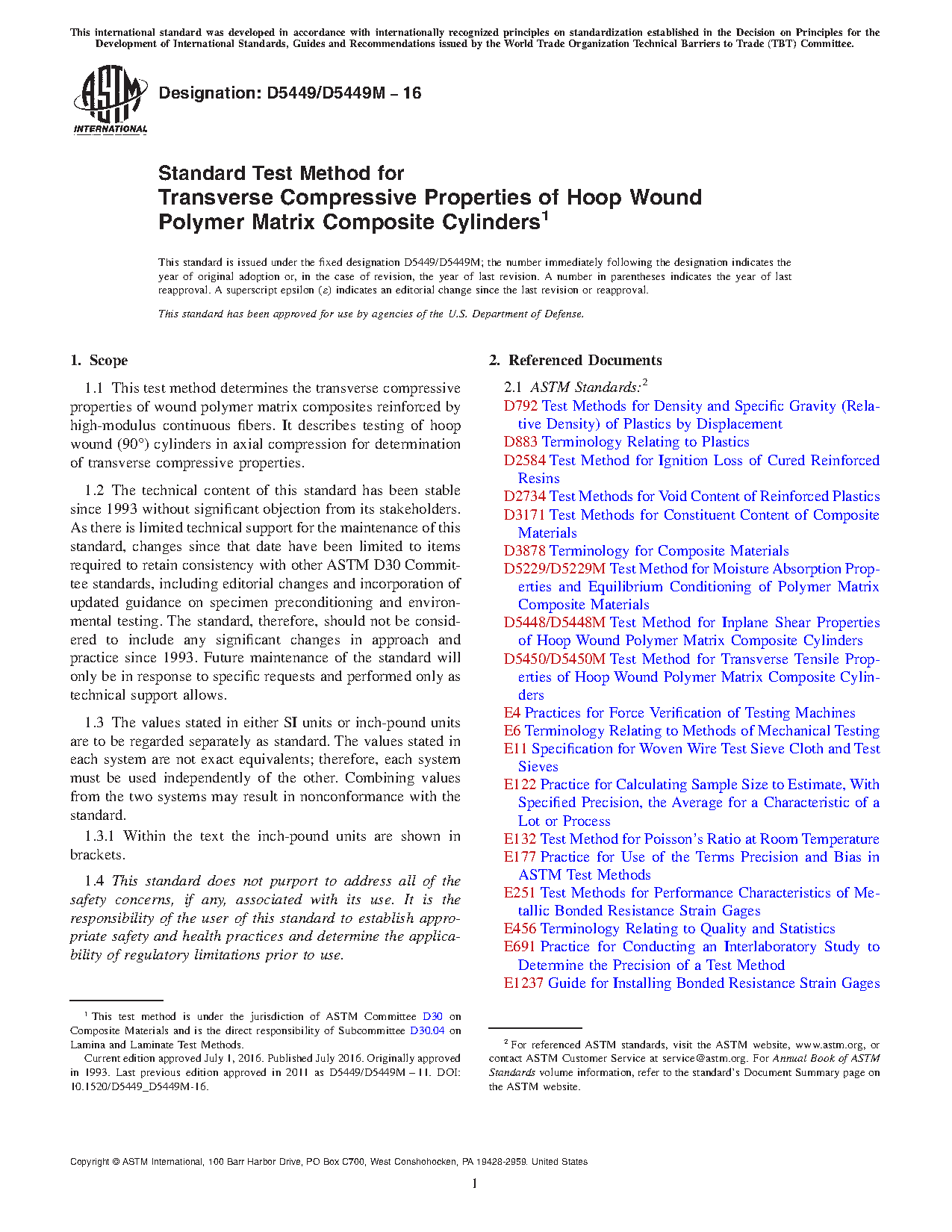 1.1 This test method determines the transverse compressive properties of wound polymer matrix composites reinforced by high-modulus continuous fibers. It describes testing of hoop wound (90°) cylinders in axial compression for determination of transverse compressive properties.