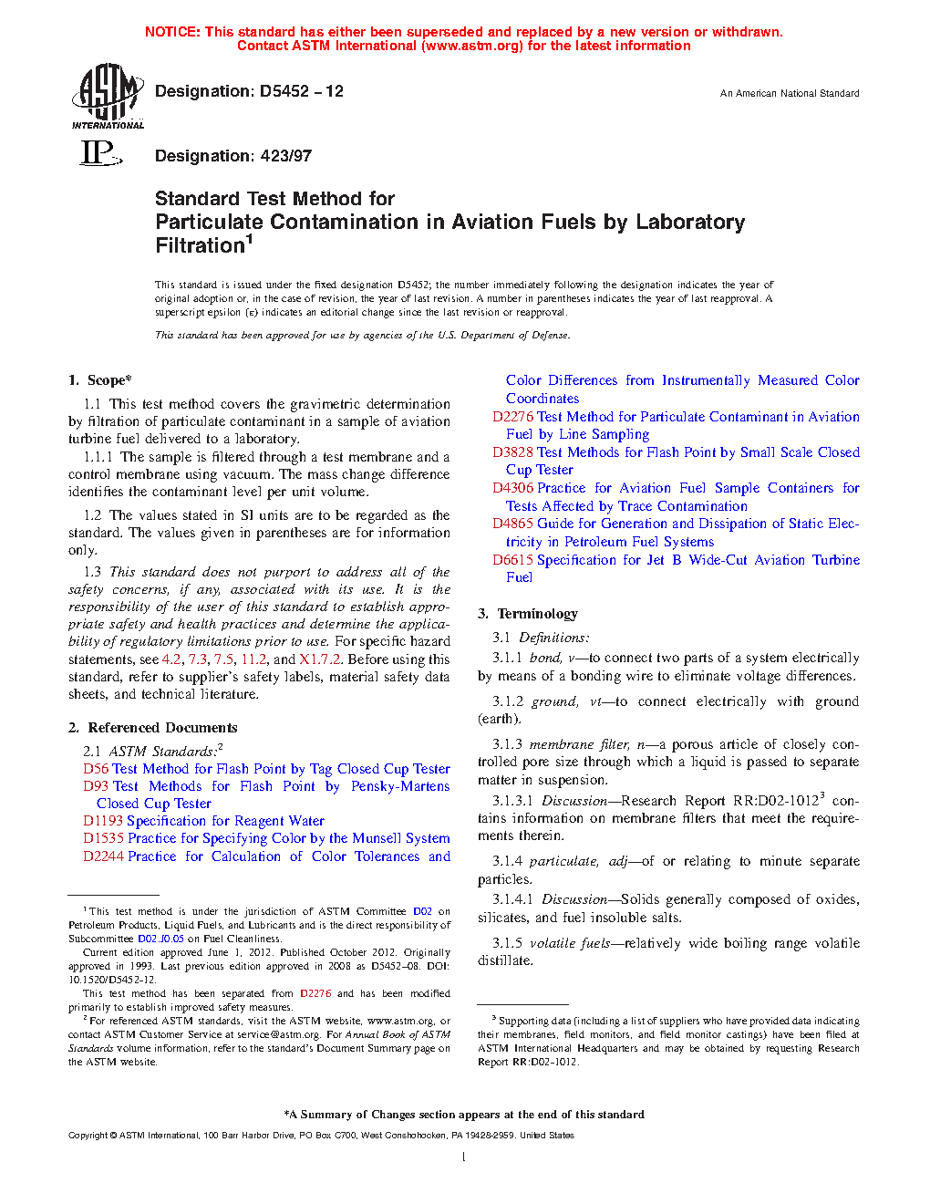 1.1 This test method covers the gravimetric determination by filtration of particulate contaminant in a sample of aviation turbine fuel delivered to a laboratory.
