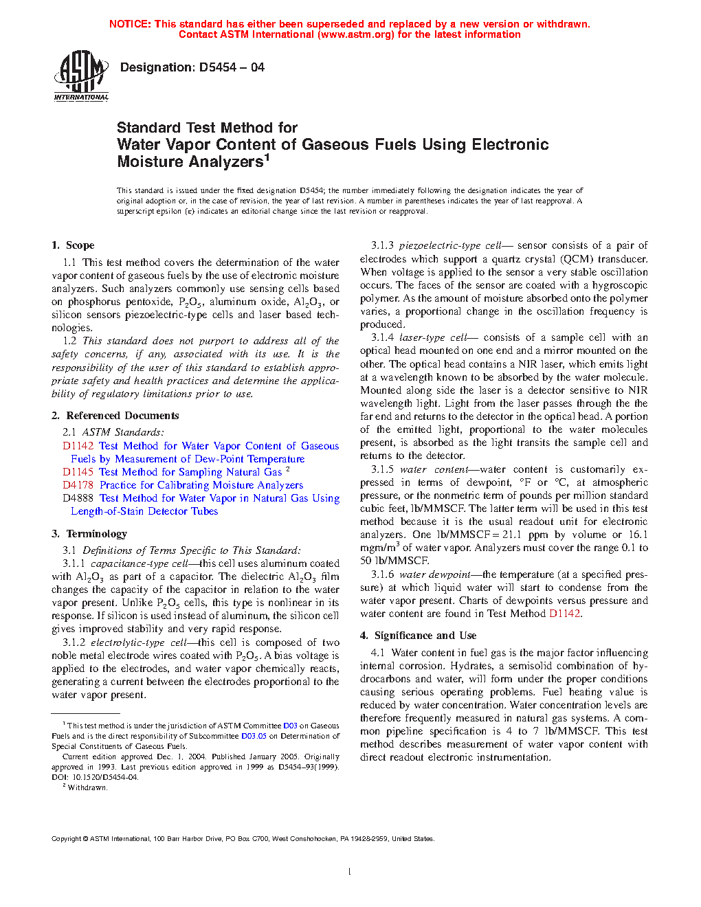 4.1 Water content in fuel gas is the major factor influencing internal corrosion. Hydrates, a semisolid combination of hydrocarbons and water, will form under the proper conditions causing serious operating problems. Fuel heating value is reduced by water concentration. Water concentration levels are therefore frequently measured in natural gas systems. A common pipeline specification is 4 to 7 lb/MMSCF. This test method describes measurement of water vapor content with direct readout electronic instrumentation.