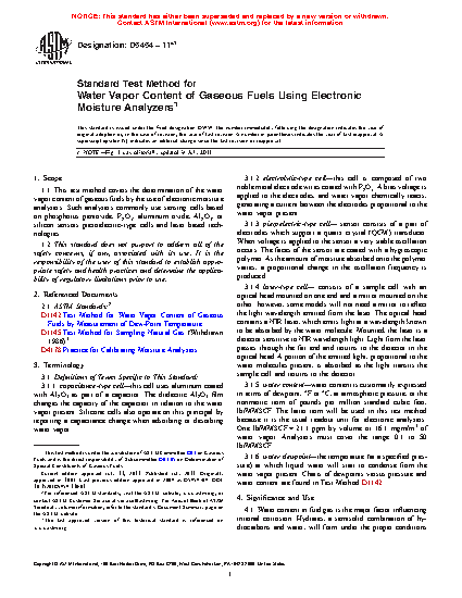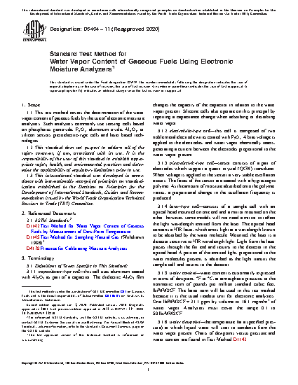 1.1 This test method covers the determination of the water vapor content of gaseous fuels by the use of electronic moisture analyzers. Such analyzers commonly use sensing cells based on phosphorus pentoxide, P2O5, aluminum oxide, Al2O3, or silicon sensors piezoelectric-type cells and laser based technologies.
