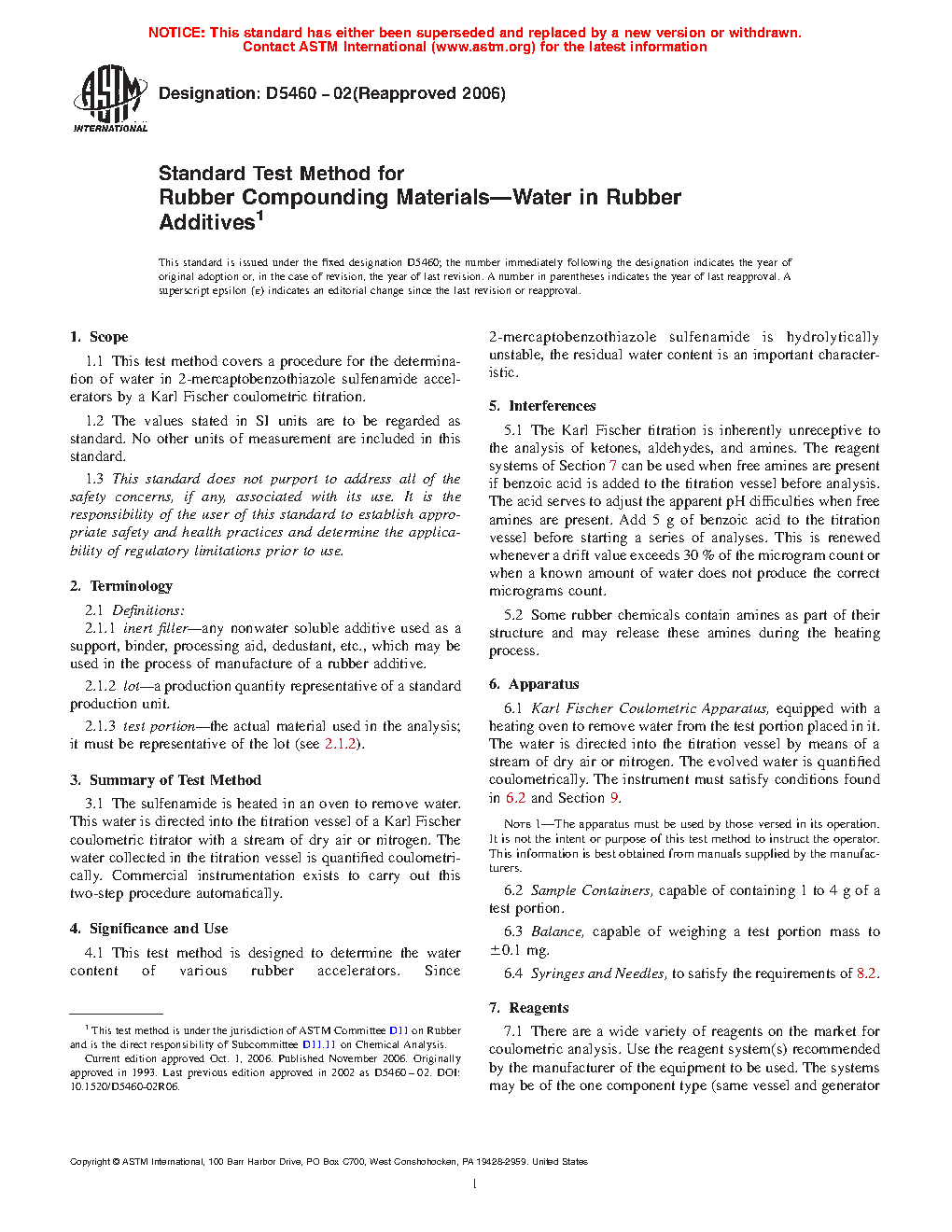 4.1 This test method is designed to determine the water content of various rubber accelerators. Since 2-mercaptobenzothiazole sulfenamide is hydrolytically unstable, the residual water content is an important characteristic.