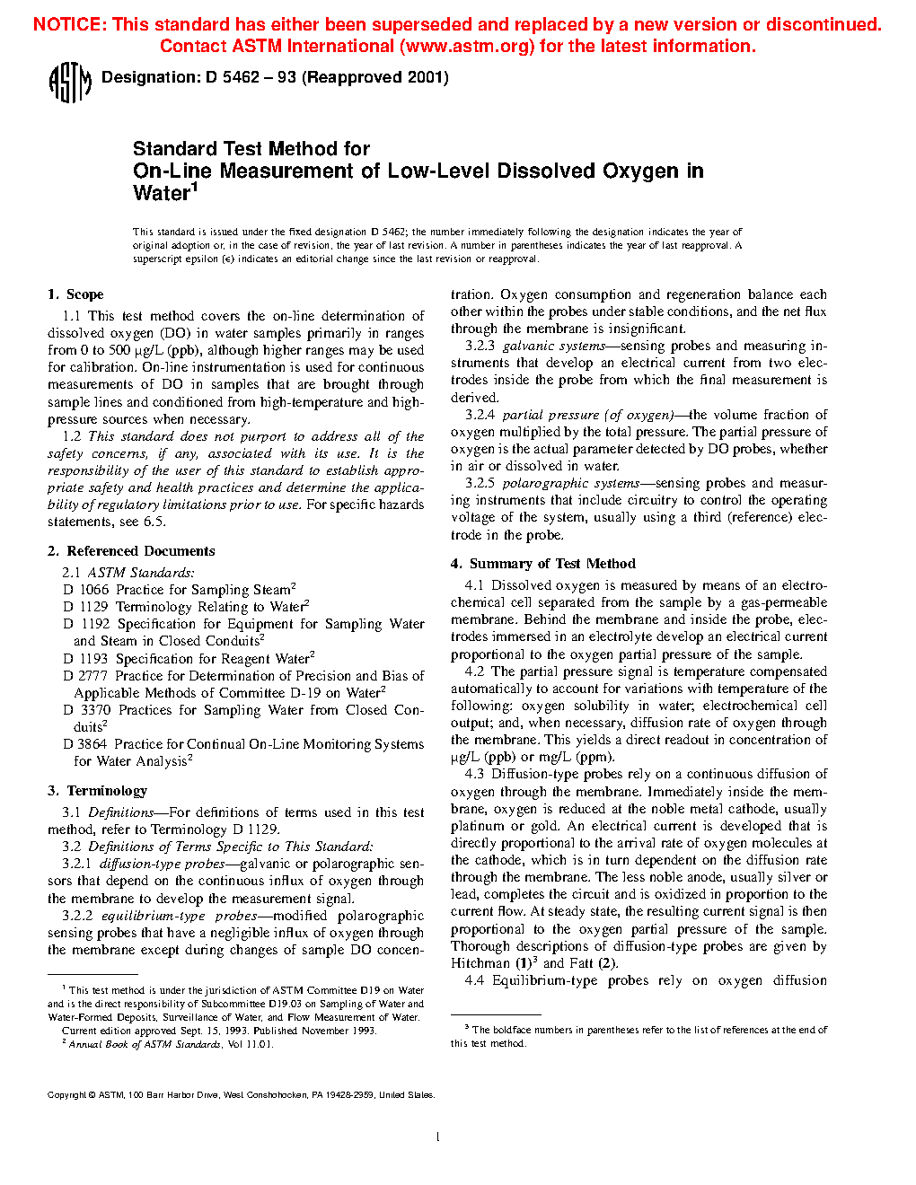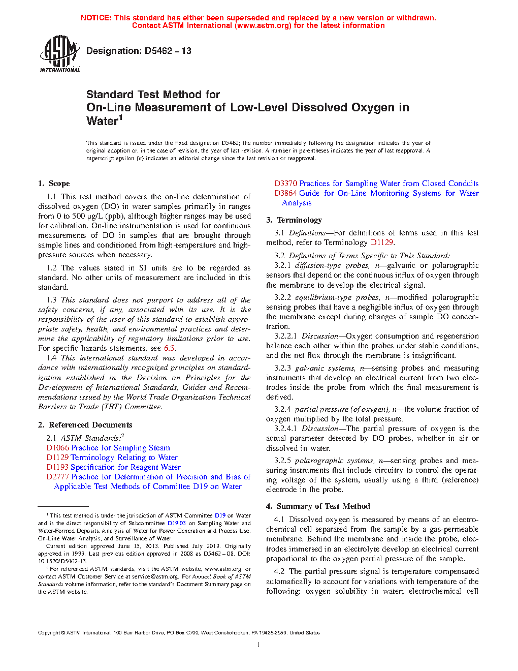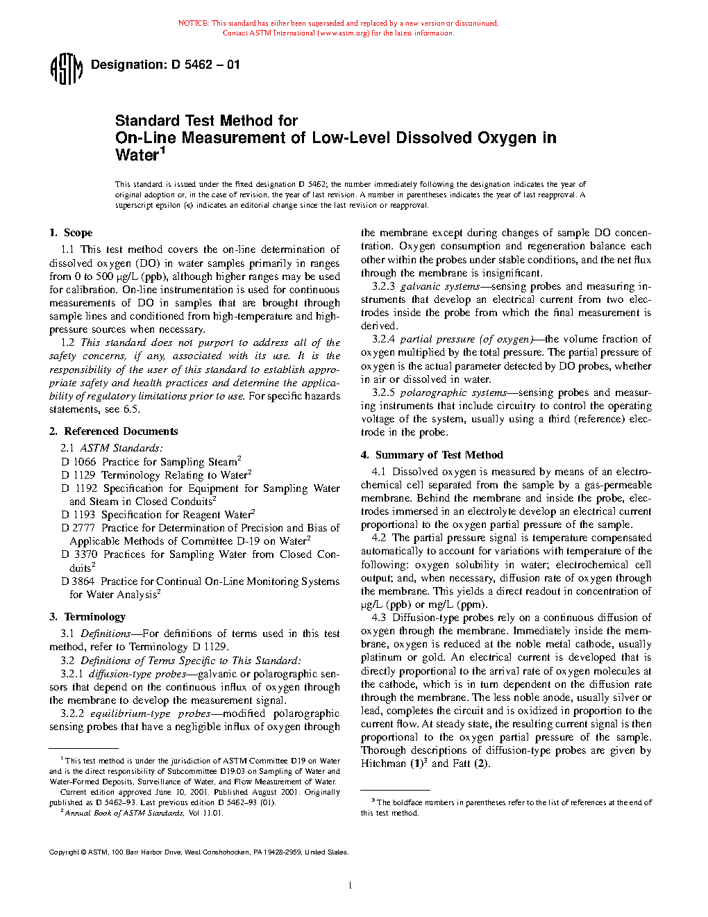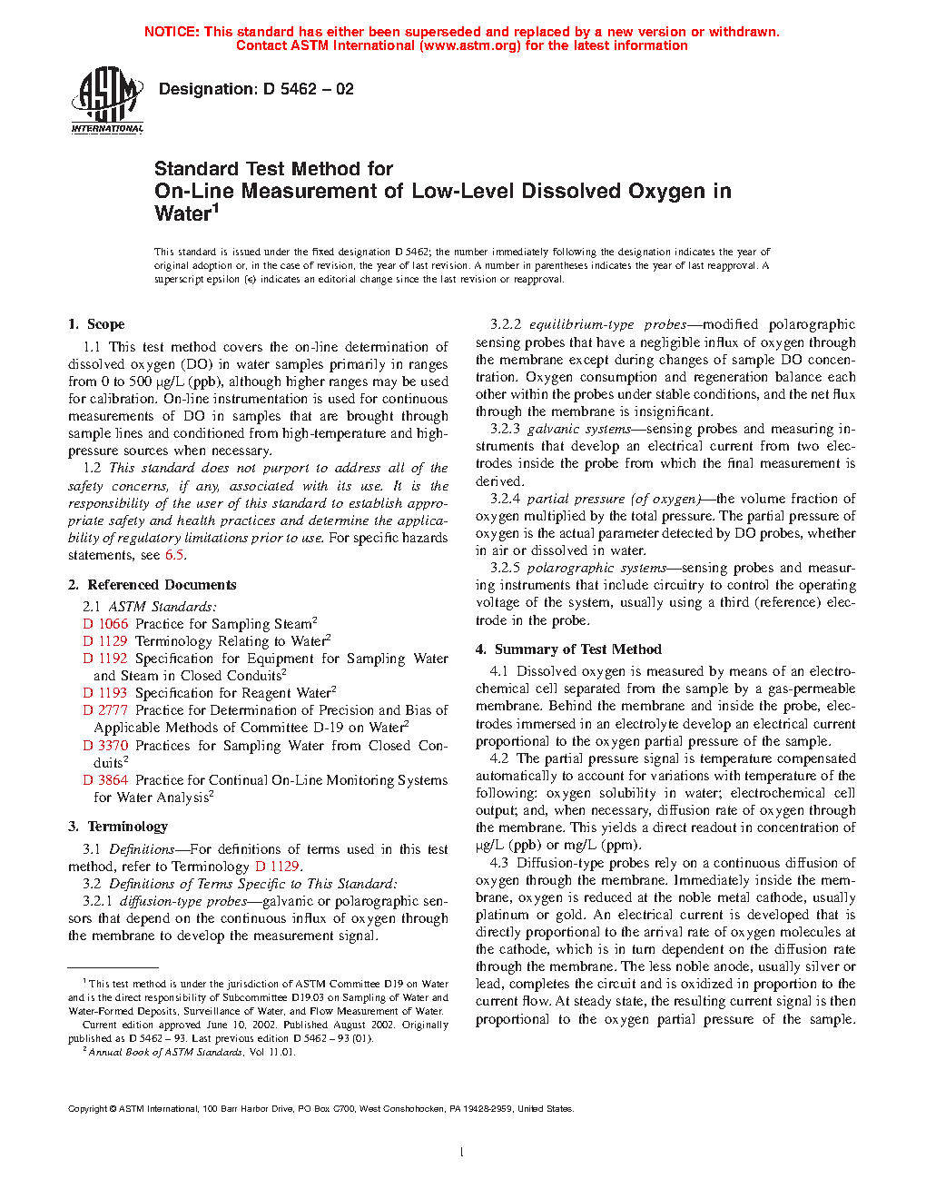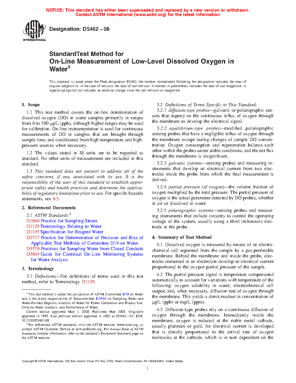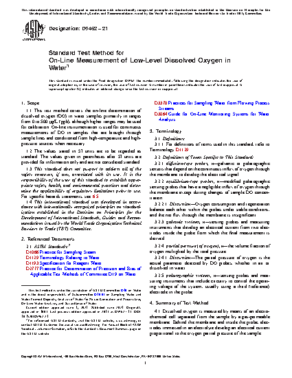 1.1 This test method covers the on-line determination of dissolved oxygen (DO) in water samples primarily in ranges from 0 to 500 μg/L (ppb), although higher ranges may be used for calibration. On-line instrumentation is used for continuous measurements of DO in samples that are brought through sample lines and conditioned from high-temperature and high-pressure sources when necessary.