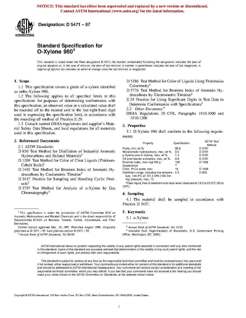 This specification covers a grade of o-xylene identified as ortho-Xylene 980. O-xylene 980 shall be tested and sampled in accordance with standard test methods and practices and shall conform to the following requirements: purity; non-aromatic hydrocarbons; p-xylene plus m-xylene; C9 and heavier aromatics; cumene; bromine index; appearance which shall be a clear liquid, free of sediment and haze; color in the platinum-cobalt scale; and distillation range.