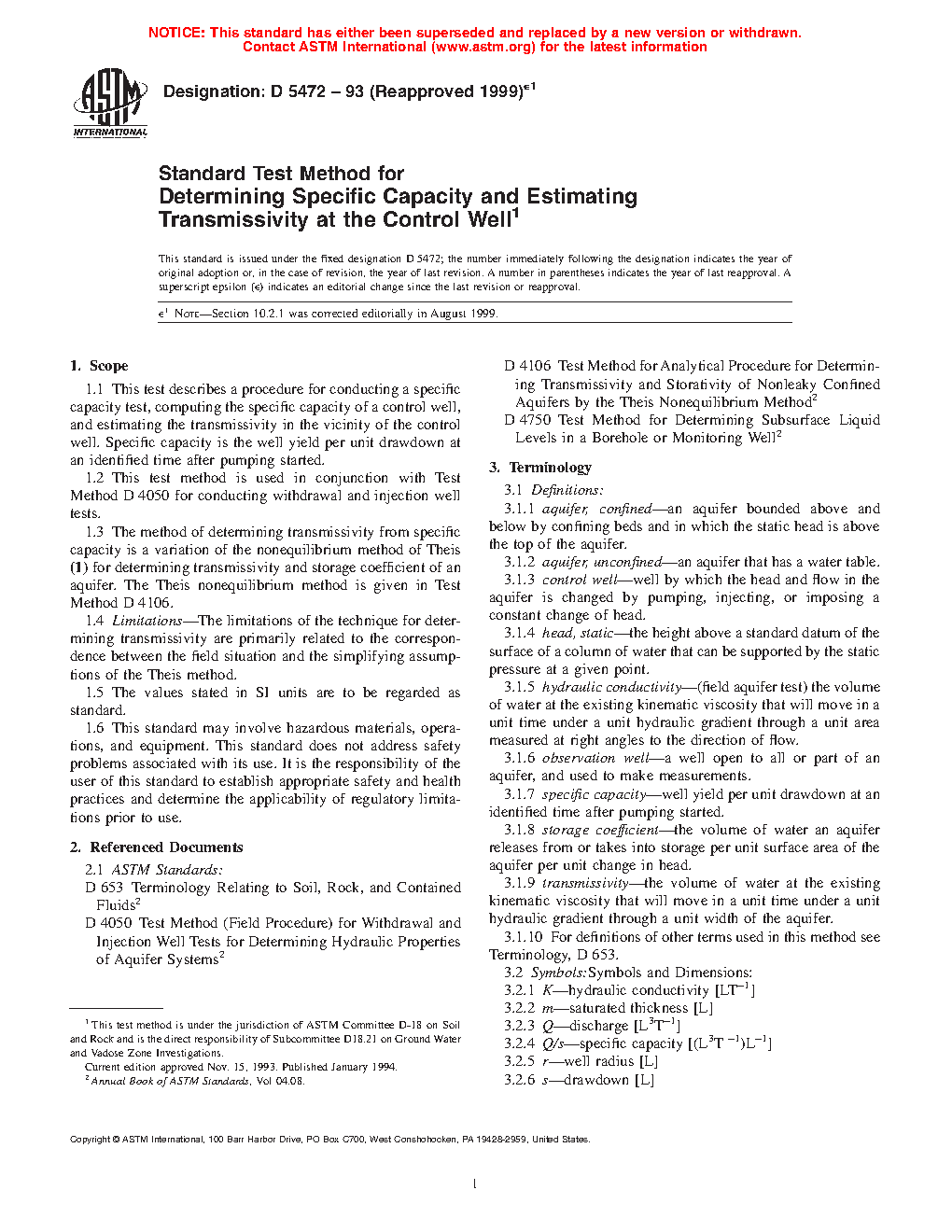 1.3 The method of determining transmissivity from specific capacity is a variation of the nonequilibrium method of Theis (1) for determining transmissivity and storage coefficient of an aquifer. The Theis nonequilibrium method is given in Test Method D4106.