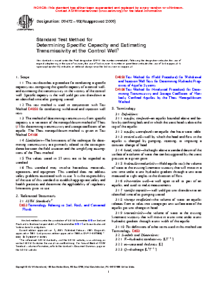 1.3 The method of determining transmissivity from specific capacity is a variation of the nonequilibrium method of Theis (1)2 for determining transmissivity and storage coefficient of an aquifer. The Theis nonequilibrium method is given in Test Method D4106.