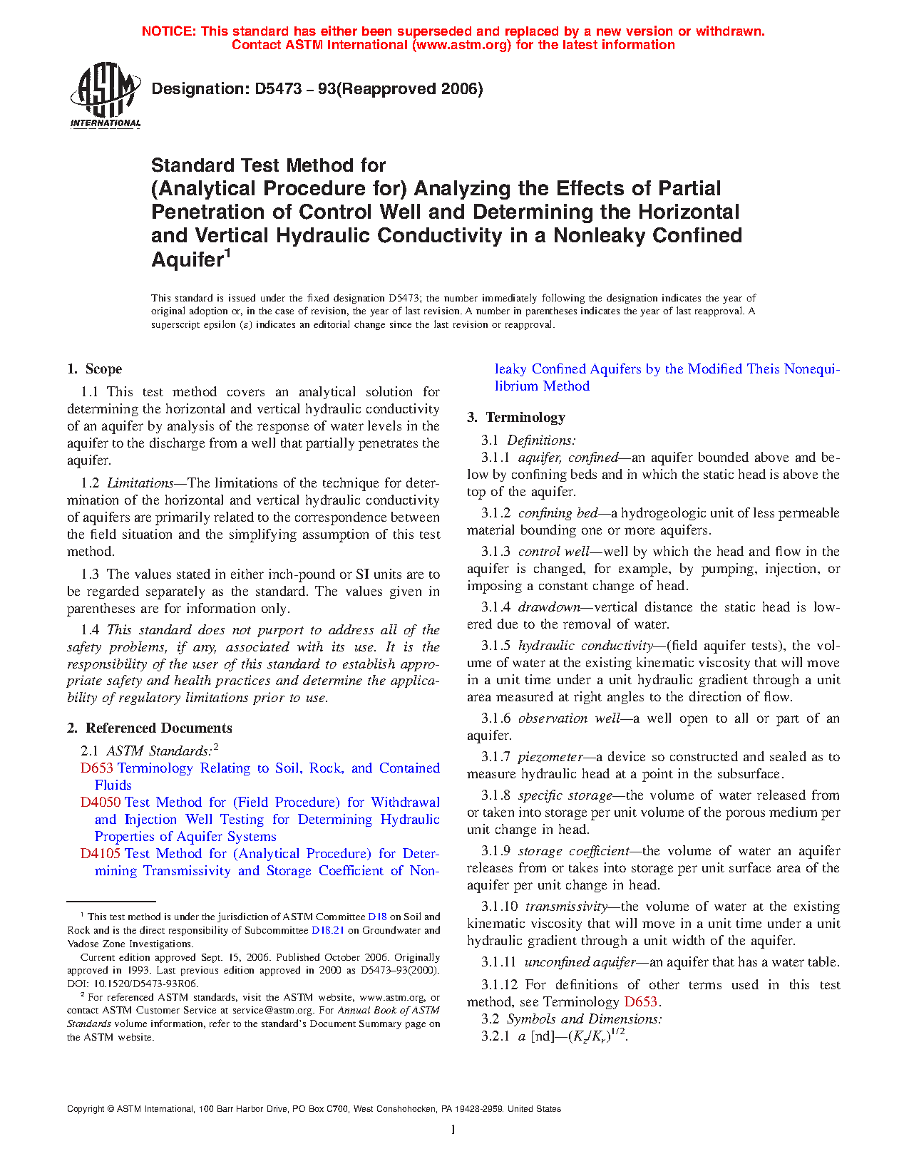 1.1 This test method covers an analytical solution for determining the horizontal and vertical hydraulic conductivity of an aquifer by analysis of the response of water levels in the aquifer to the discharge from a well that partially penetrates the aquifer. This standard uses data derived from Test Method D4050.