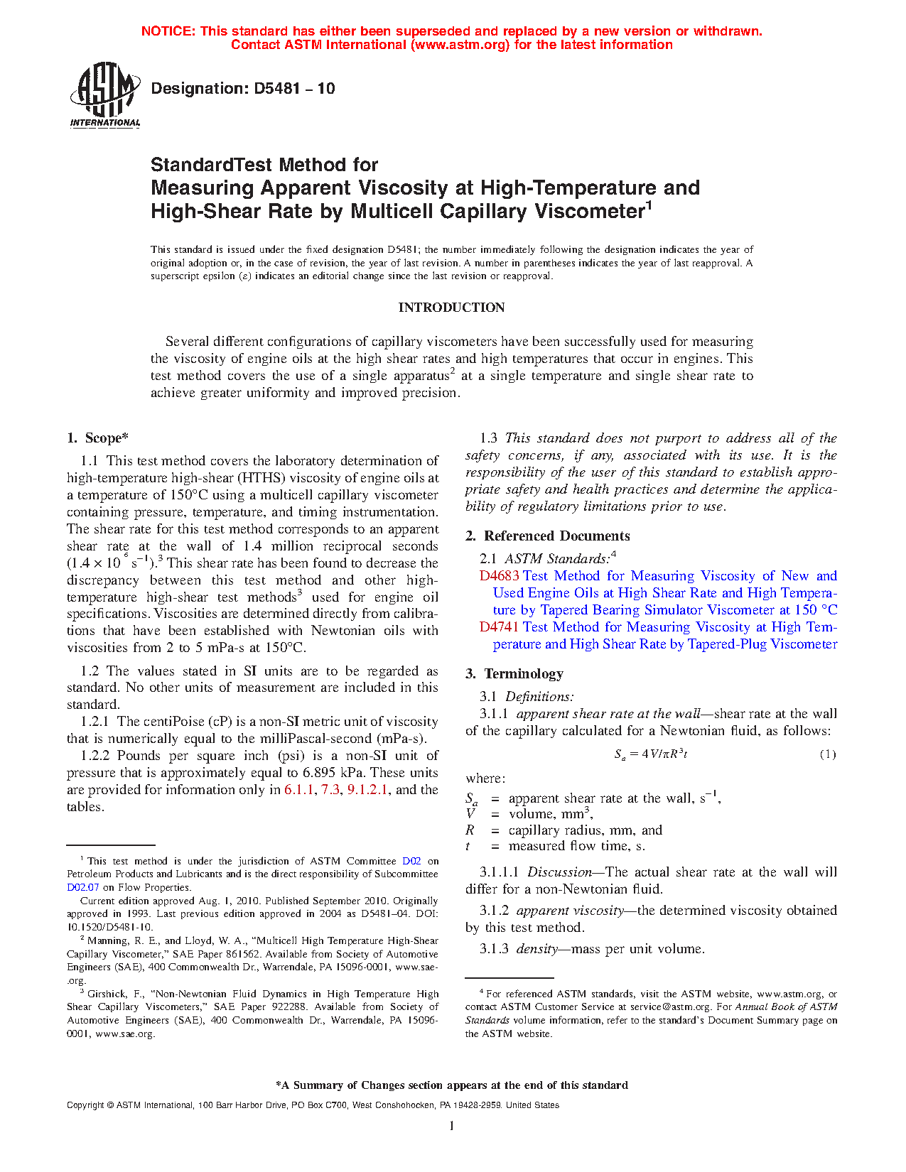 1.1 This test method covers the laboratory determination of high-temperature high-shear (HTHS) viscosity of engine oils at a temperature of 150 °C using a multicell capillary viscometer containing pressure, temperature, and timing instrumentation. The shear rate for this test method corresponds to an apparent shear rate at the wall of 1.4 million reciprocal seconds (1.4 × 106 s-1).3 This shear rate has been found to decrease the discrepancy between this test method and other high-temperature high-shear test methods3 (Test Methods D4683 and D4741) used for engine oil specifications. Viscosities are determined directly from calibrations that have been established with Newtonian oils with nominal viscosities from 1.4 mPa·s to 5.0 mPa·s at 150 °C. The precision has only been determined for the viscosity range 1.45 mPa·s and 5.05 mPa·s at 150 °C for the materials listed in the precision section.