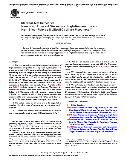 5.3 Many equipment manufacturers and lubricant specifications require a minimum high-temperature high-shear viscosity at 150 °C and 106 s-1. The shear rate in capillary viscometers varies across the radius of the capillary. The apparent shear rate at the wall for this test method is increased to compensate for the variable shear rate.3