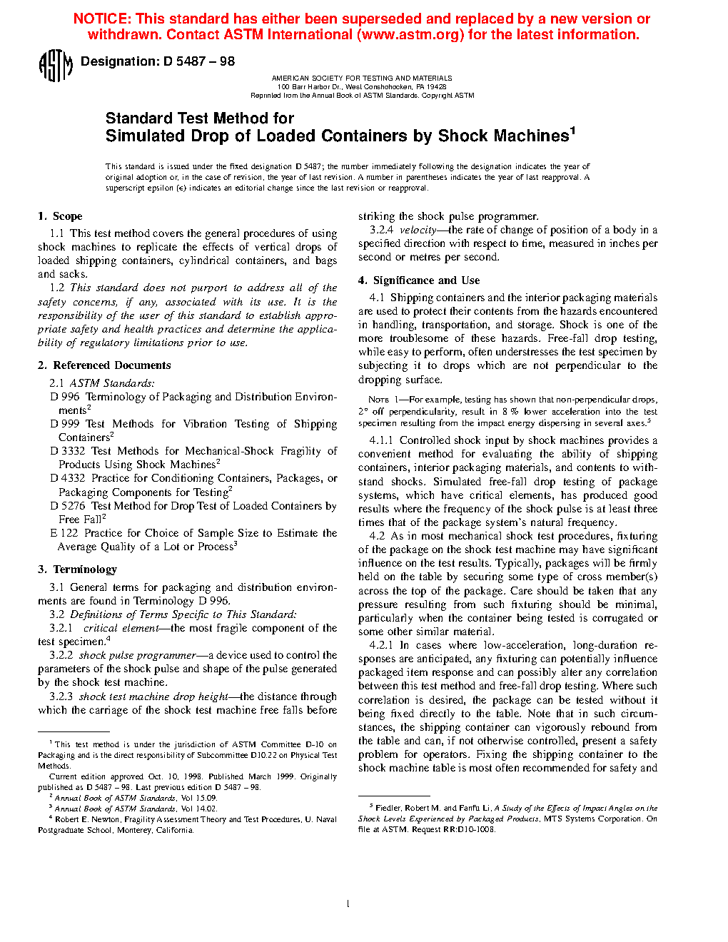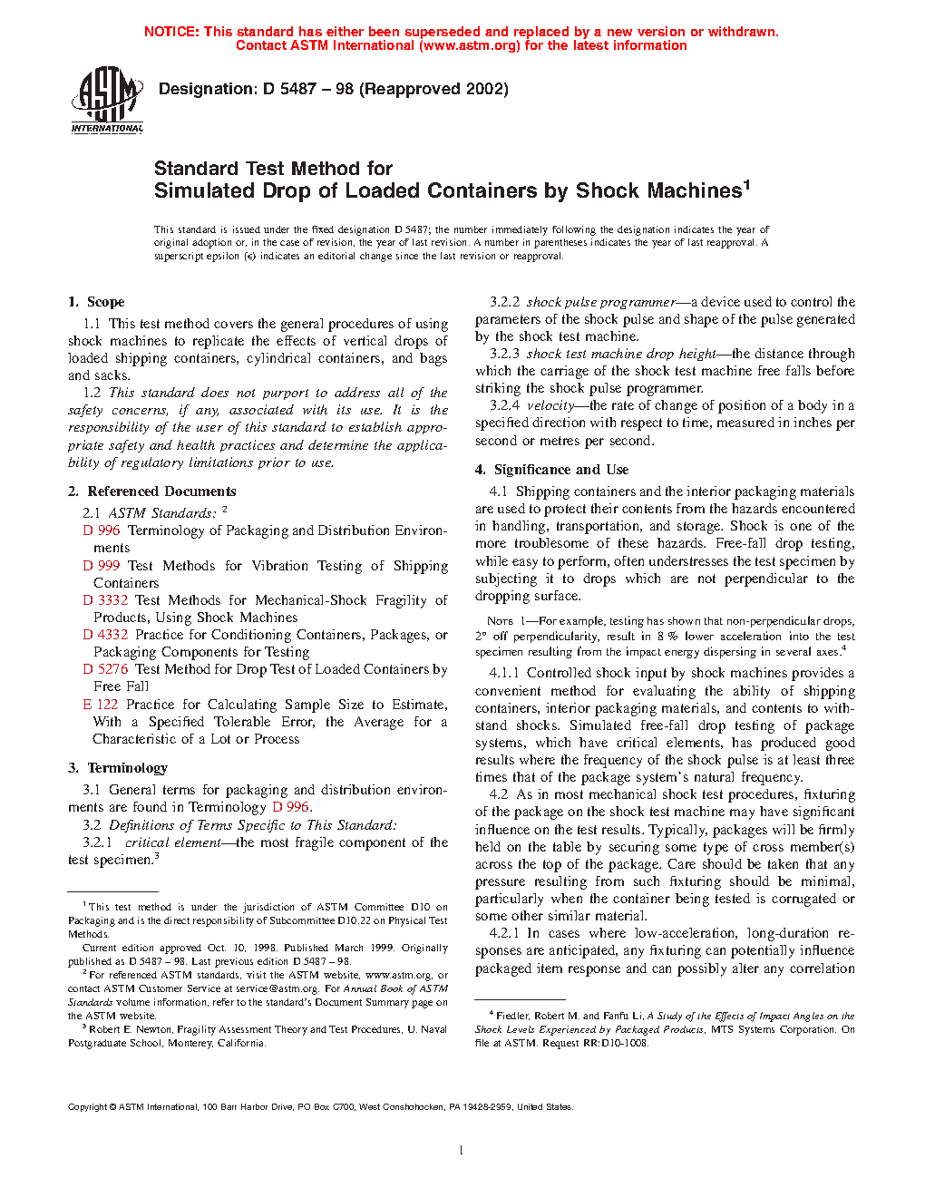 4.1 Shipping containers and the interior packaging materials are used to protect their contents from the hazards encountered in handling, transportation, and storage. Shock is one of the more troublesome of these hazards. Free-fall drop testing, while easy to perform, often understresses the test specimen by subjecting it to drops which are not perpendicular to the dropping surface.