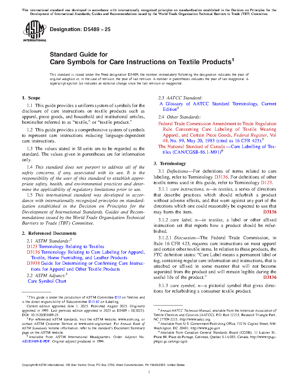 4.1 This guide provides symbols and a system for their use by which care instructions for textile products can be conveyed in a simple, space-saving, and easily understood pictorial format that is not language dependent. See also ADJD5489-E-PDF. Currently, the FTC Care Labeling Rule recognizes Guide D5489-96c.