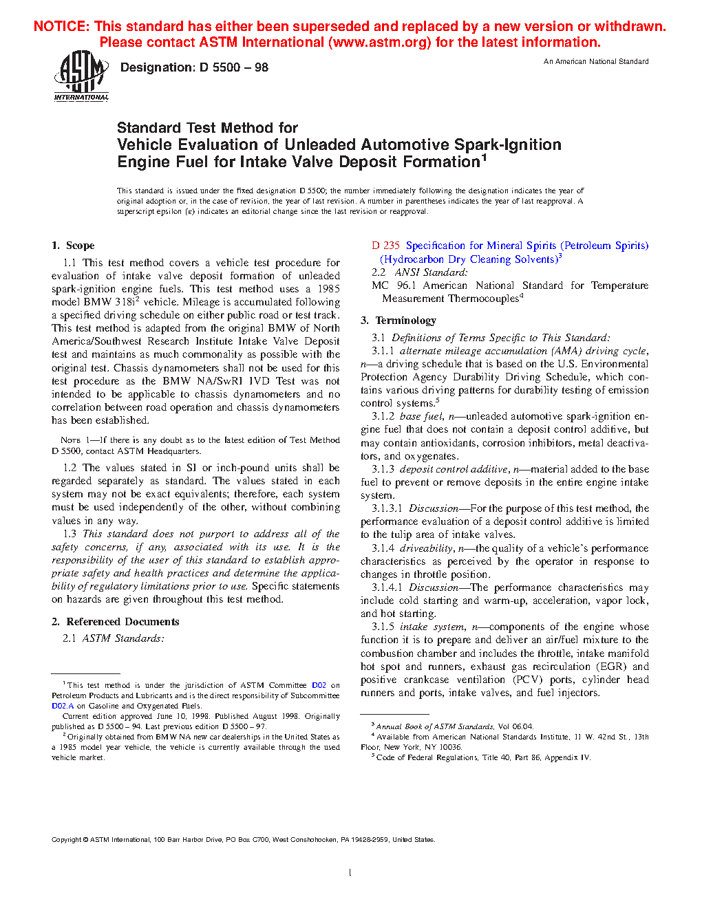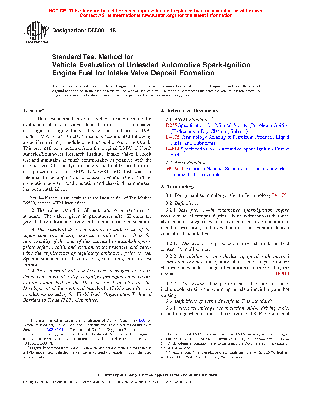 1.1 This test method covers a vehicle test procedure for evaluation of intake valve deposit formation of unleaded spark-ignition engine fuels. This test method uses a 1985 model BMW 318i2 vehicle. Mileage is accumulated following a specified driving schedule on either public road or test track. This test method is adapted from the original BMW of North America/Southwest Research Institute Intake Valve Deposit test and maintains as much commonality as possible with the original test. Chassis dynamometers shall not be used for this test procedure as the BMW NA/SwRI IVD Test was not intended to be applicable to chassis dynamometers and no correlation between road operation and chassis dynamometers has been established.