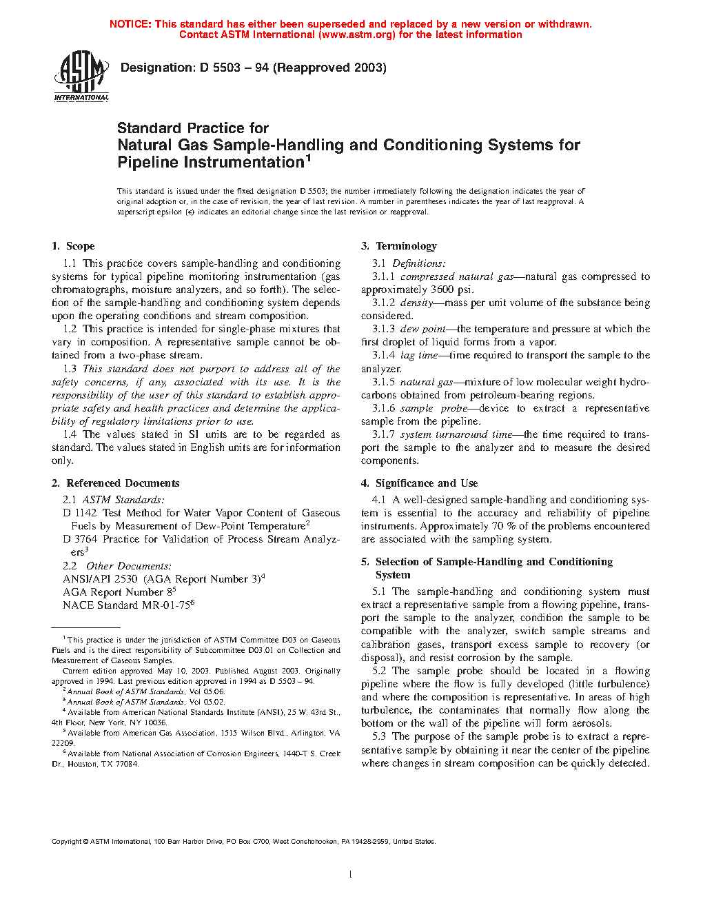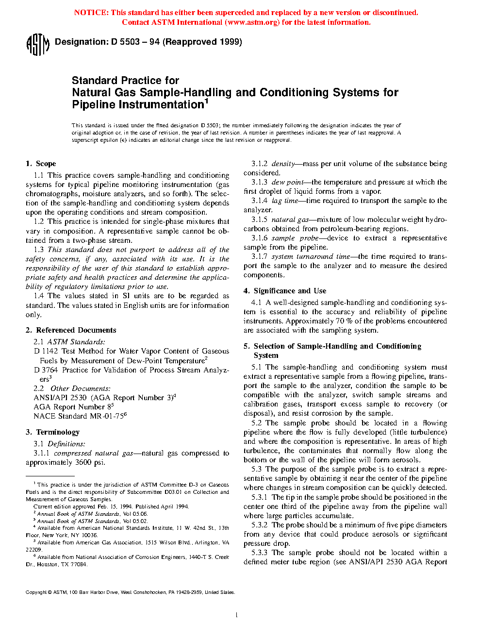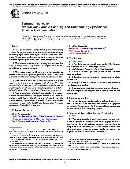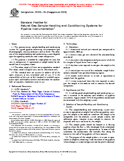 1.1 This practice covers sample-handling and conditioning systems for typical pipeline monitoring instrumentation (gas chromatographs, moisture analyzers, etc.). The selection of the sample-handling and conditioning system depends upon the operating conditions and stream composition.