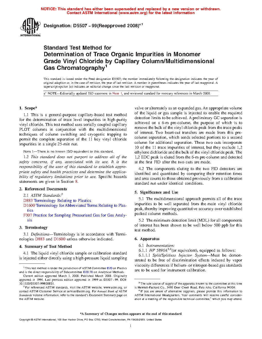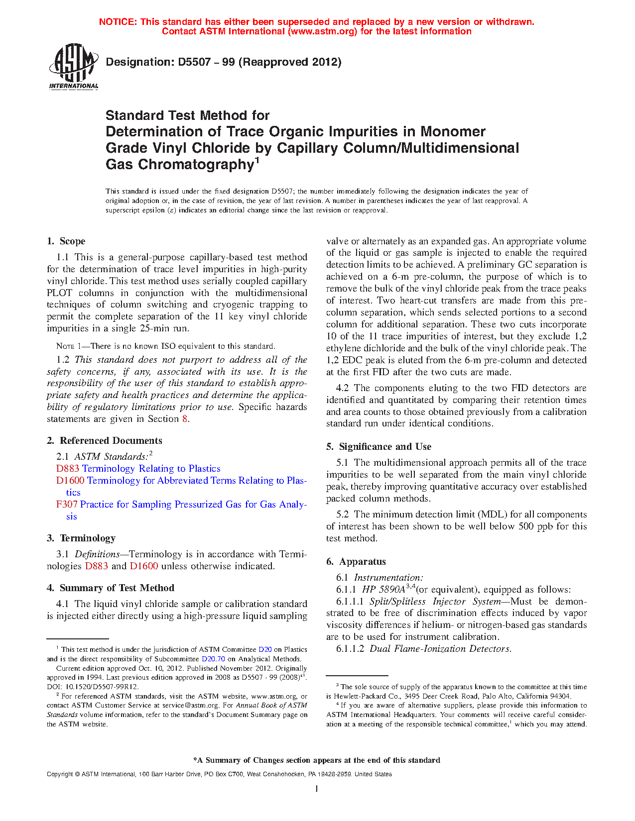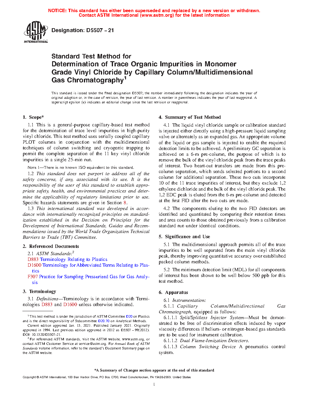 1.1 This is a general-purpose capillary-based test method for the determination of trace level impurities in high-purity vinyl chloride. This test method uses serially coupled capillary PLOT columns in conjunction with the multidimensional techniques of column switching and cryogenic trapping to permit the complete separation of the 11 key vinyl chloride impurities in a single 25-min run.