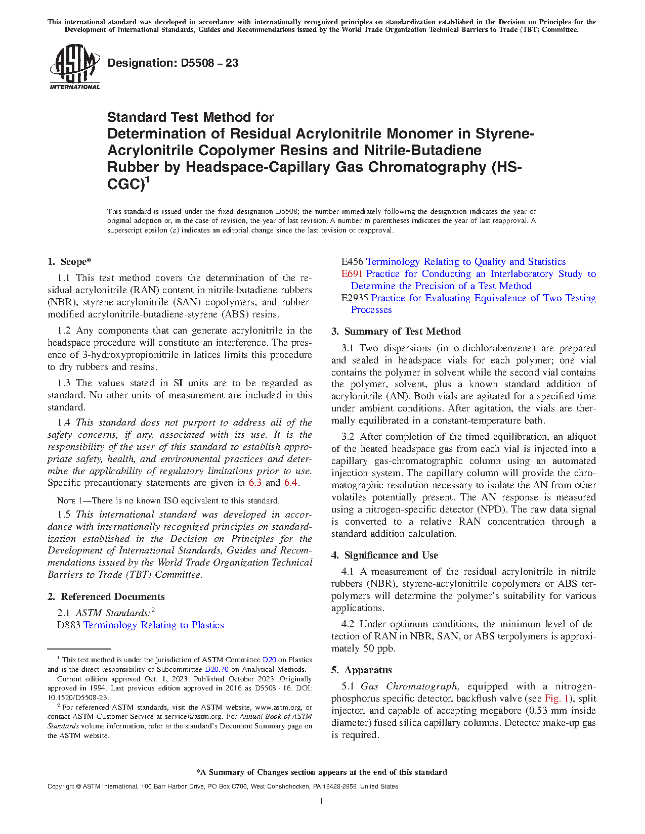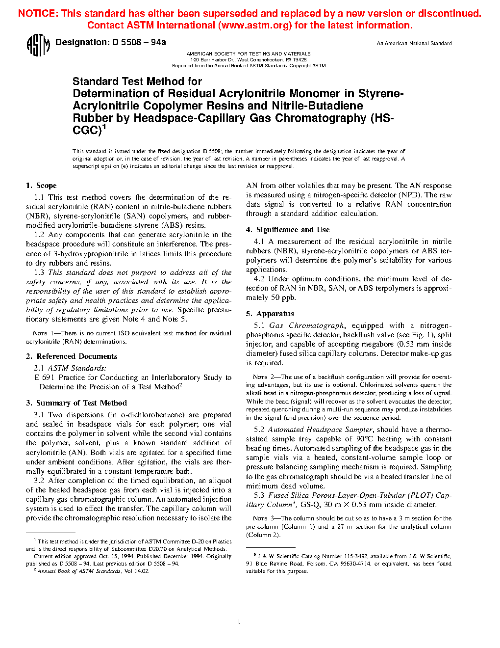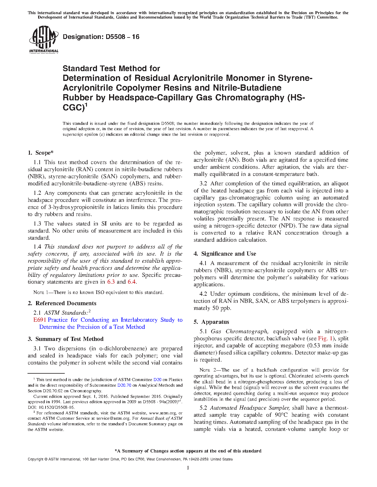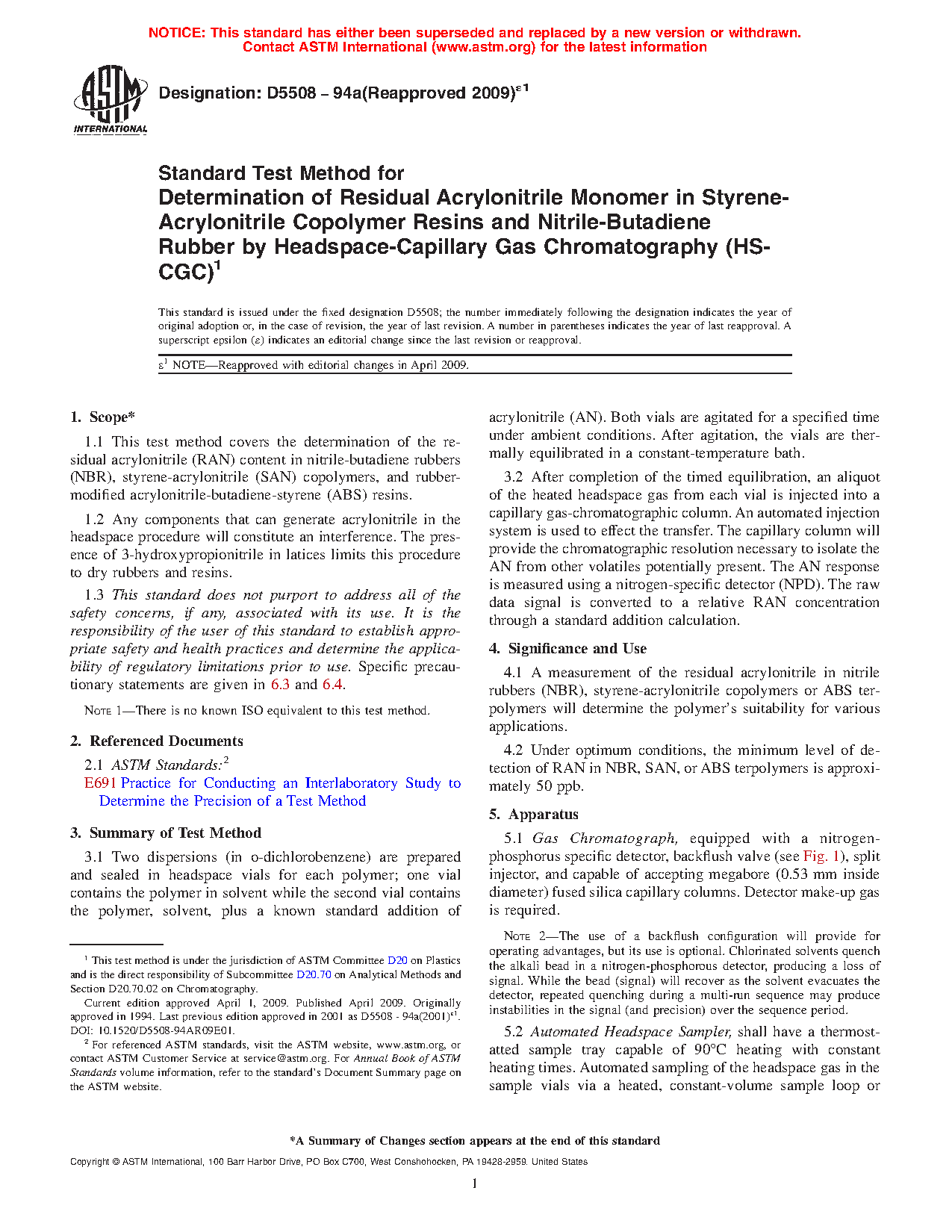 1.1 This test method covers the determination of the residual acrylonitrile (RAN) content in nitrile-butadiene rubbers (NBR), styrene-acrylonitrile (SAN) copolymers, and rubber-modified acrylonitrile-butadiene-styrene (ABS) resins.