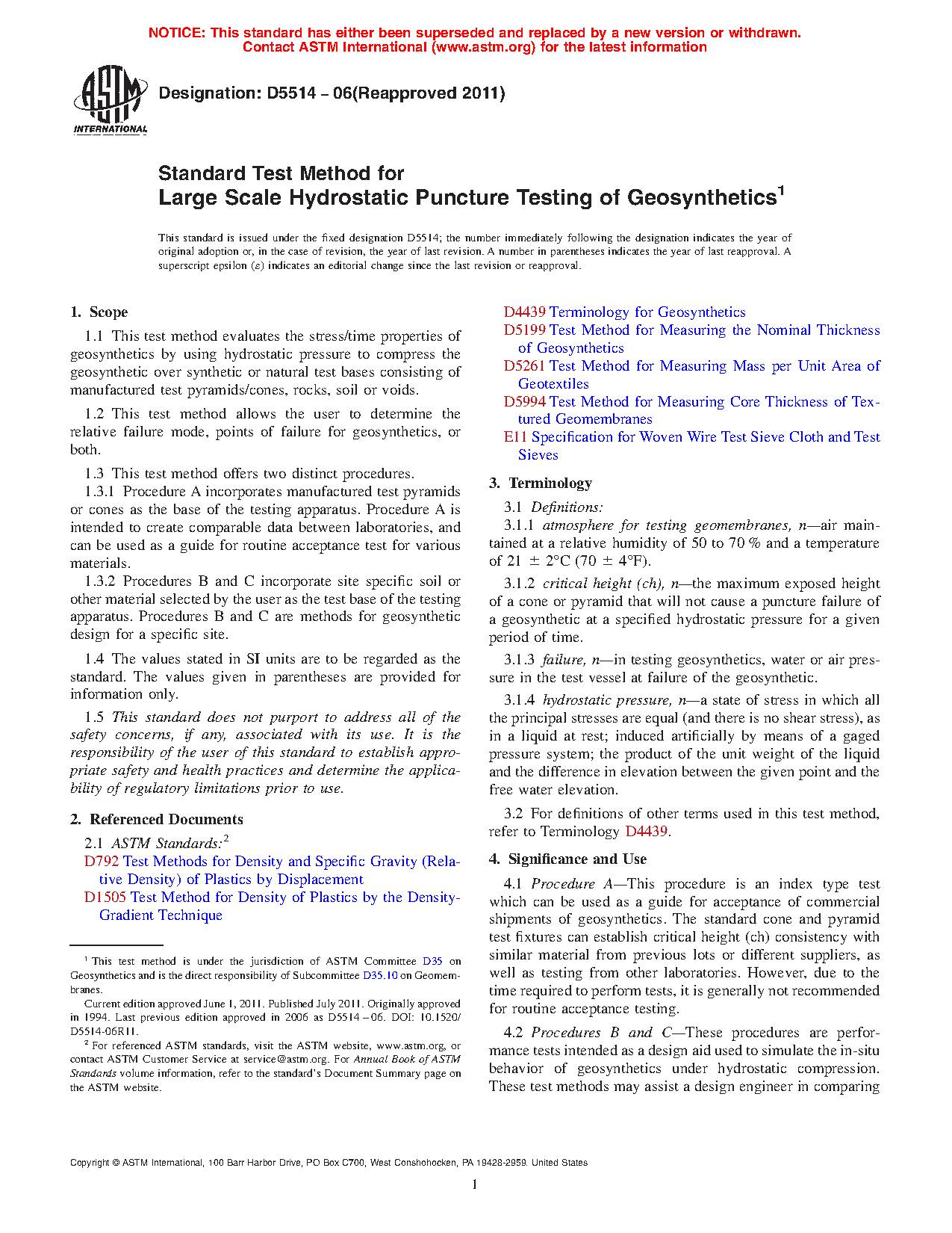 4.1 Procedure A—This procedure is an index type test which can be used as a guide for acceptance of commercial shipments of geosynthetics. The standard cone and pyramid test fixtures can establish critical height (ch) consistency with similar material from previous lots or different suppliers, as well as testing from other laboratories. However, due to the time required to perform tests, it is generally not recommended for routine acceptance testing.