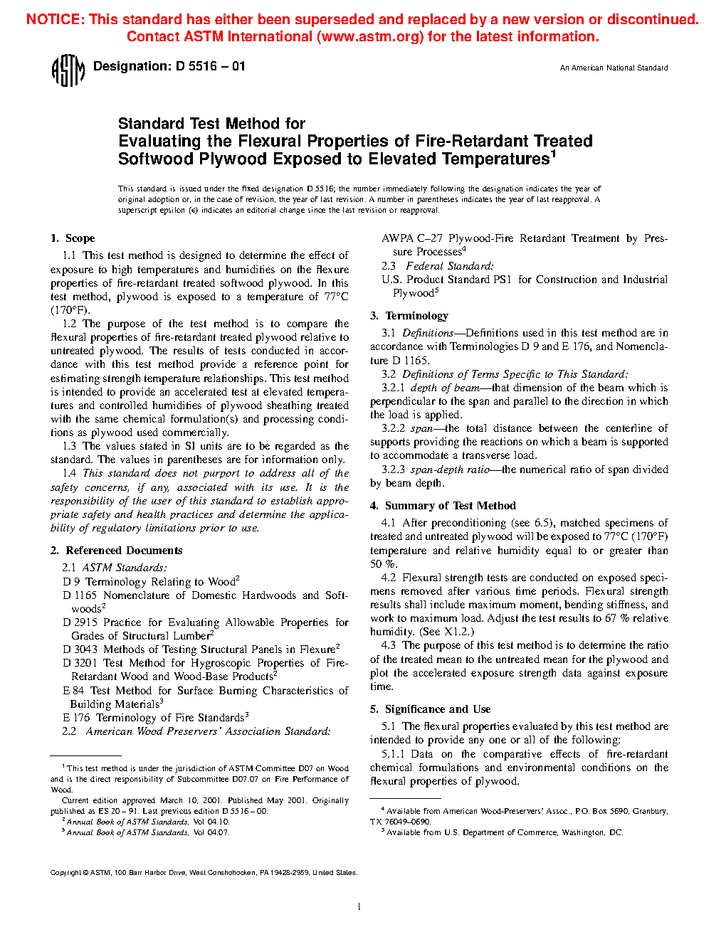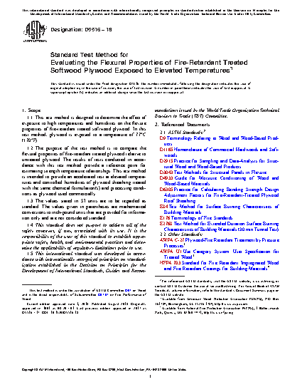 1.1 This test method is designed to determine the effect of exposure to high temperatures and humidities on the flexure properties of fire-retardant treated softwood plywood. In this test method, plywood is exposed to a temperature of 77°C (170°F).