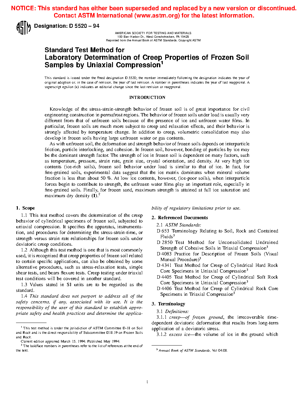 1.2 Although this test method is one that is most commonly used, it is recognized that creep properties of frozen soil related to certain specific applications, can also be obtained by some alternative procedures, such as stress-relaxation tests, simple shear tests, and beam flexure tests. Creep testing under triaxial test conditions will be covered in another standard.