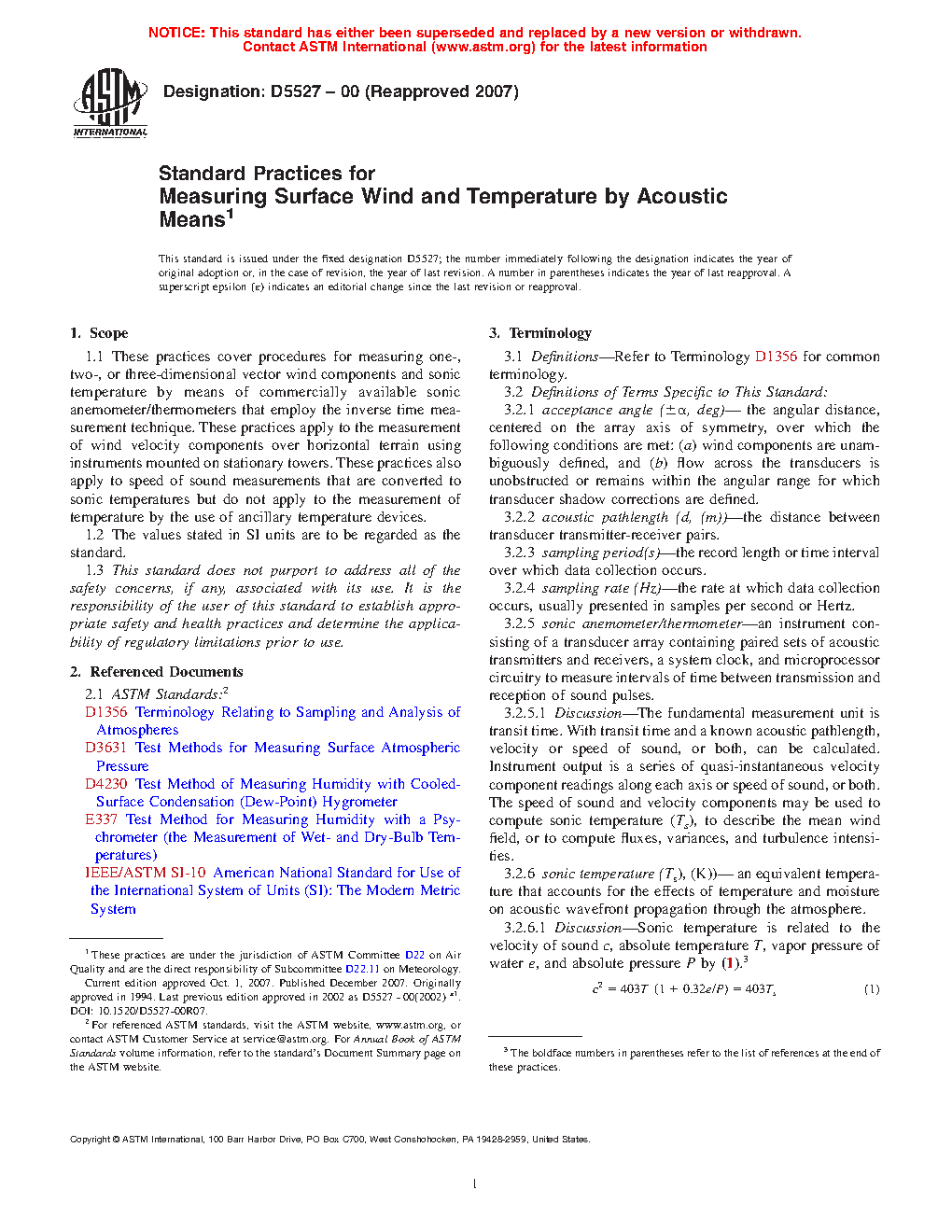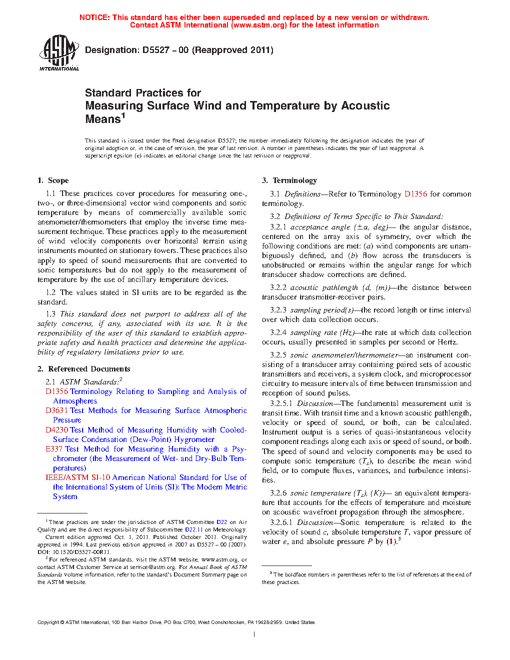 1.1 These practices cover procedures for measuring one-, two-, or three-dimensional vector wind components and sonic temperature by means of commercially available sonic anemometer/thermometers that employ the inverse time measurement technique. These practices apply to the measurement of wind velocity components over horizontal terrain using instruments mounted on stationary towers. These practices also apply to speed of sound measurements that are converted to sonic temperatures but do not apply to the measurement of temperature using ancillary temperature devices.