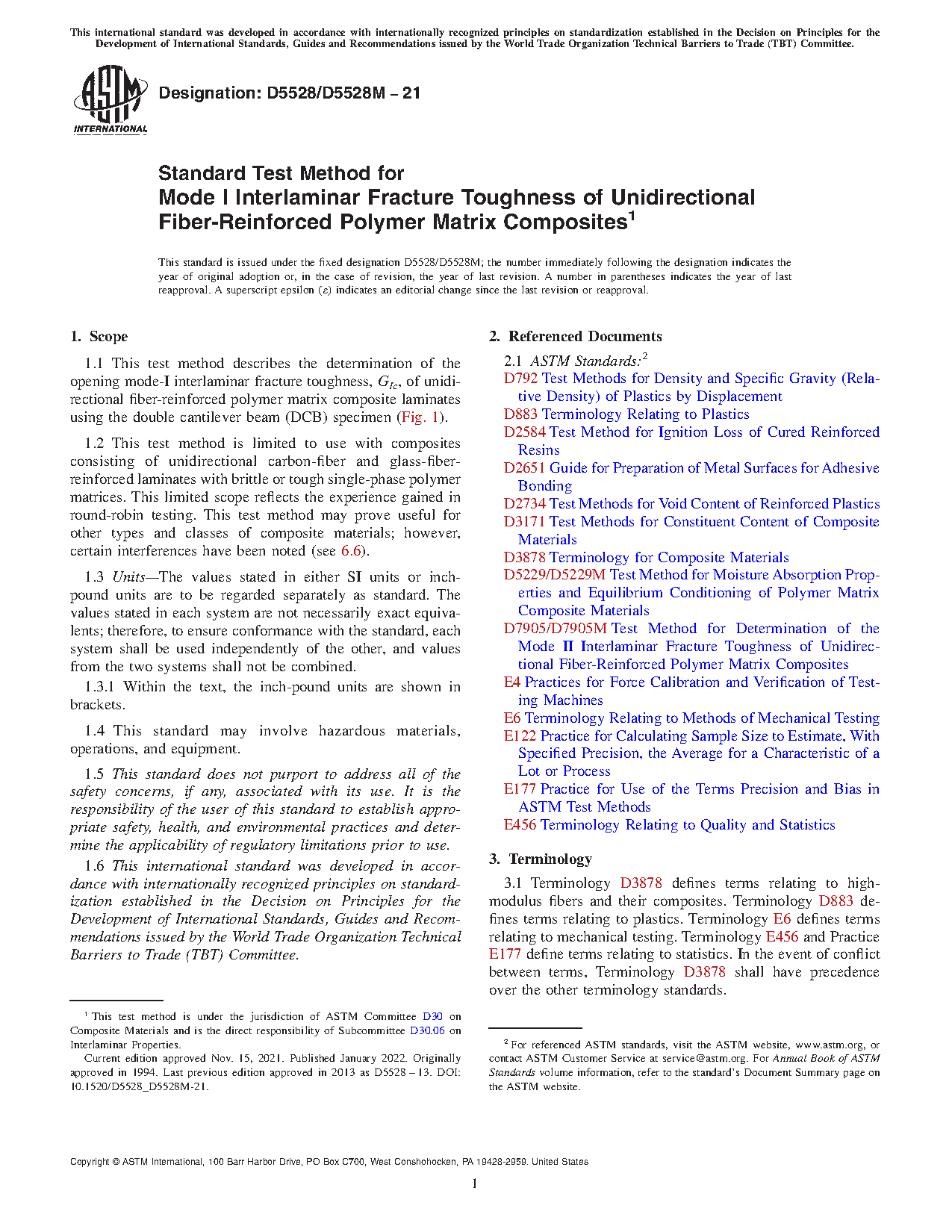 1.1 This test method describes the determination of the opening mode-I interlaminar fracture toughness, GIc, of unidirectional fiber-reinforced polymer matrix composite laminates using the double cantilever beam (DCB) specimen (Fig. 1).