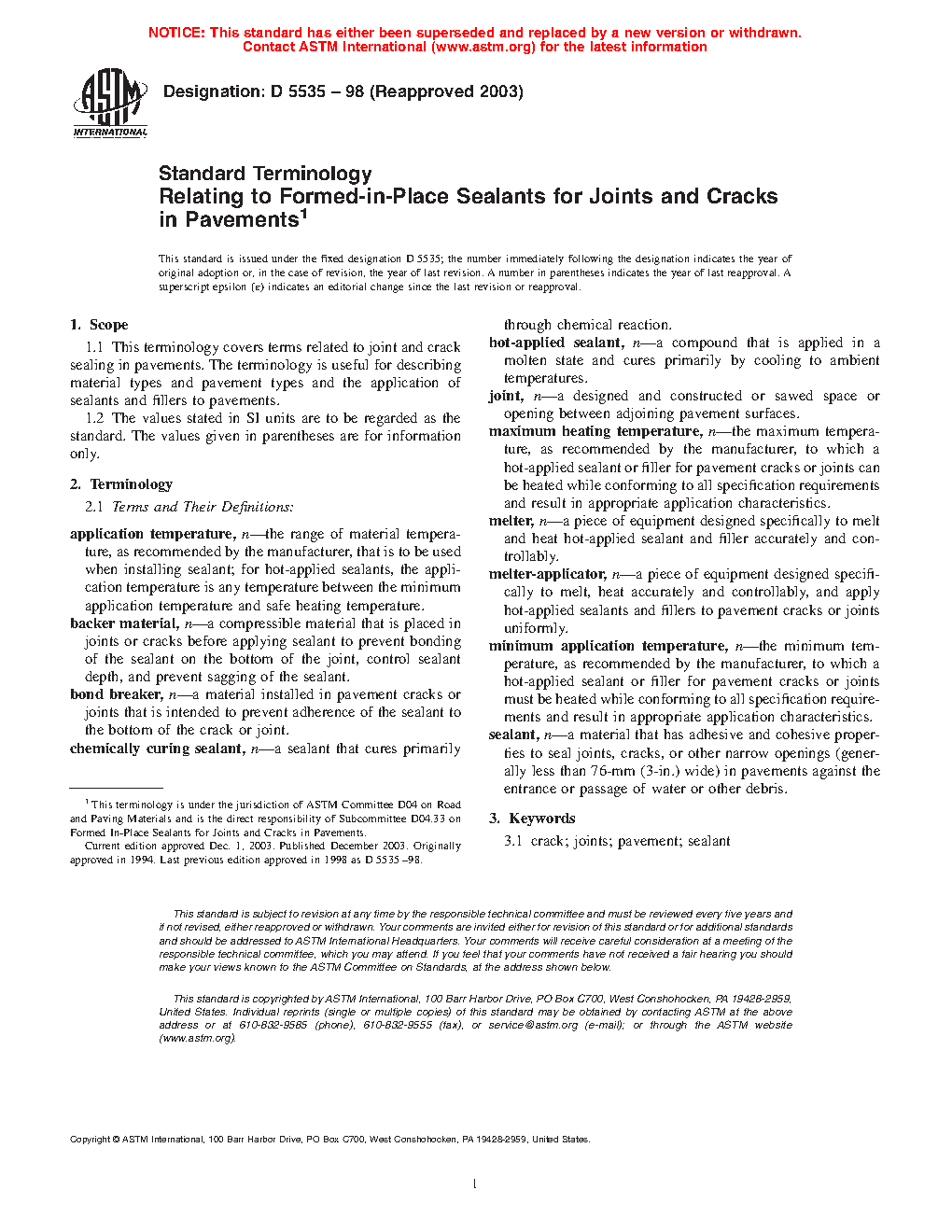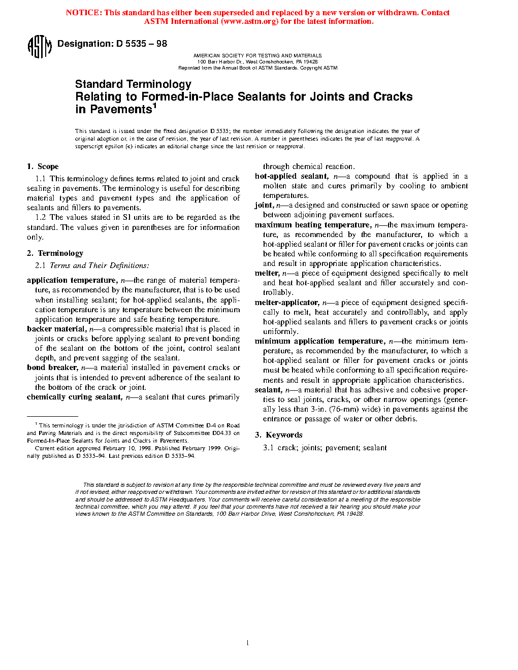 1.1 This terminology defines terms related to joint and crack sealing in pavements. The terminology is useful for describing material types and pavement types and the application of sealants and fillers to pavements.