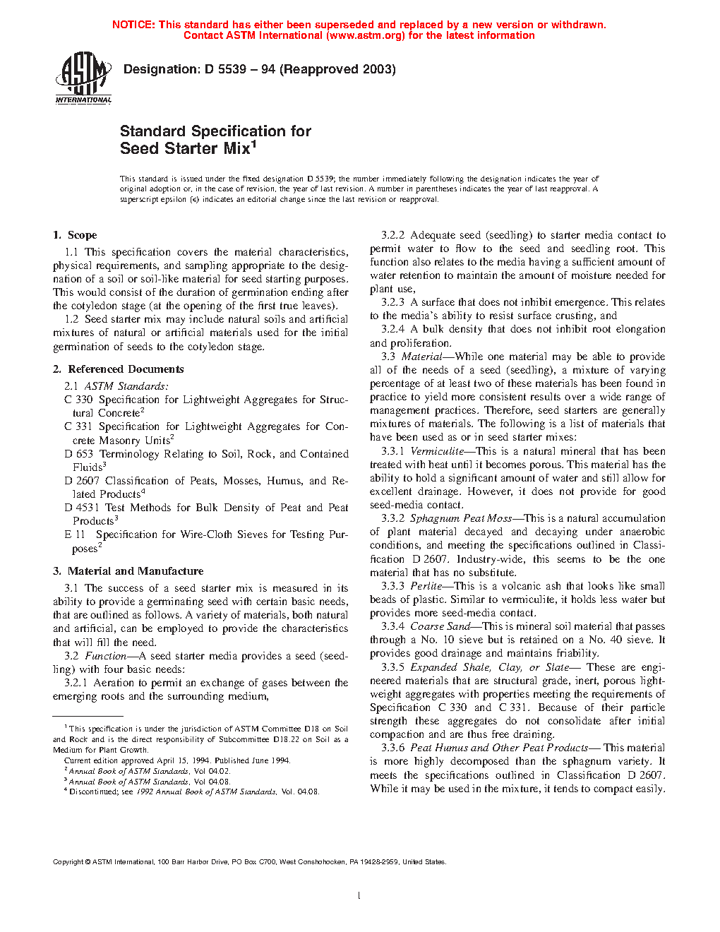 1.1 This specification covers the material characteristics, physical requirements, and sampling appropriate to the designation of a soil or soil-like material for seed starting purposes. This would consist of the duration of germination ending after the cotyledon stage (at the opening of the first true leaves).
