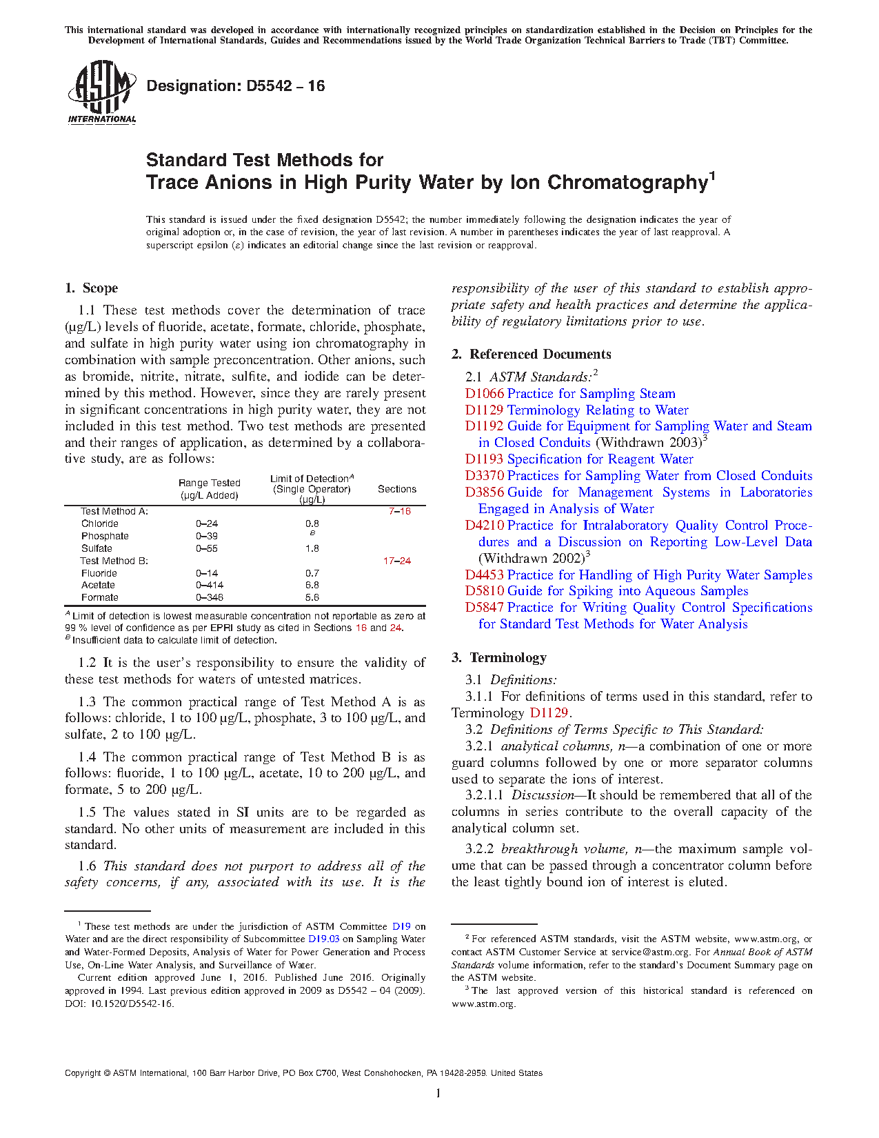 1.4 The common practical range of Test Method B is as follows: fluoride, 1 to 100 μg/L, acetate, 10 to 200 μg/L, and formate, 5 to 200 μg/L.