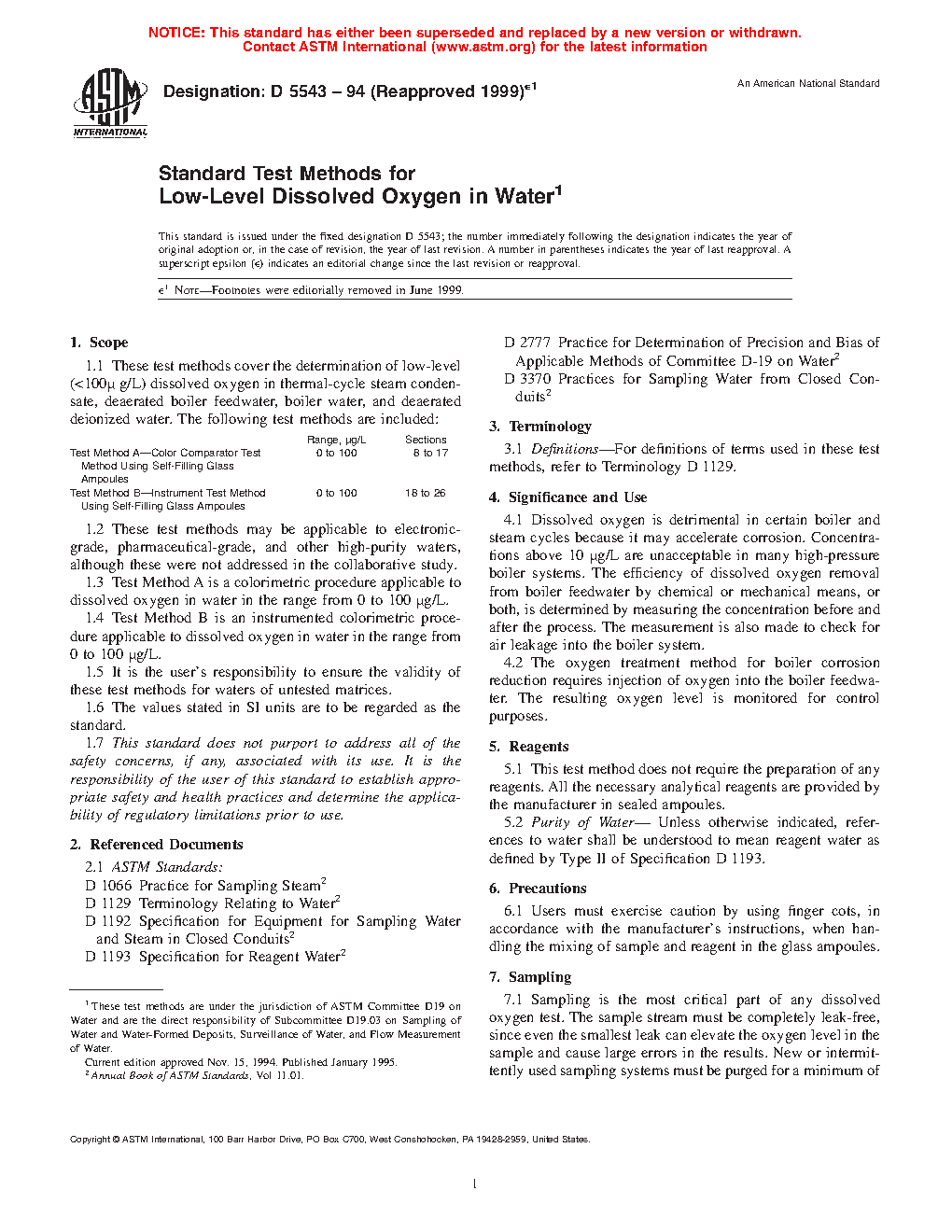 1.1 This test method covers the rapid determination of low-level (<100 μg/L) dissolved oxygen in thermal-cycle steam condensate, deaerated boiler feedwater, boiler water, and deaerated deionized water. Color comparators allow the estimation of concentrations ranging from 0 to 100 μg/L (ppb) oxygen.