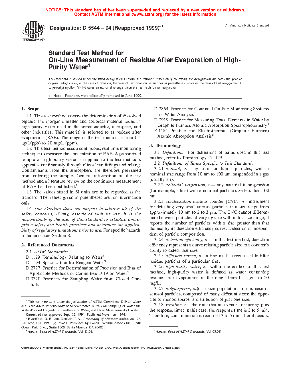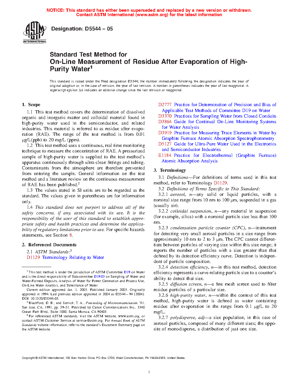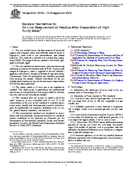 1.1 This test method covers the determination of dissolved organic and inorganic matter and colloidal material found in high-purity water used in the semiconductor, and related industries. This material is referred to as residue after evaporation (RAE). The range of the test method is from 0.001 μg/L(ppb) to 60 μg/L (ppb).