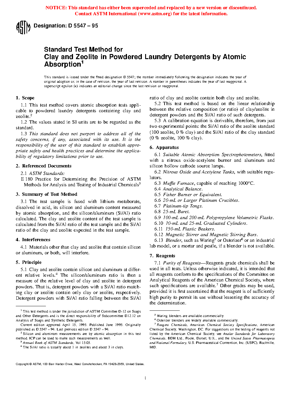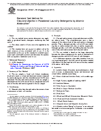 This test method covers atomic absorption tests applicable to powdered laundry detergents containing clay and zeolite. The test sample is fused with lithium metaborate, dissolved in acid, its silicon and aluminum content measured by atomic absorption, and the silicon/aluminum (Si/Al) ratio calculated. The clay and zeolite content of the test sample is calculated from the Si/Al ratio of the test sample and the Si/Al ratio of the clay and zeolite expected in the test sample. This test method is based on the linear relationship between the relative composition (or ratio) of clay/zeolite in detergent powders and the Si/Al ratio of such detergents.