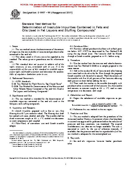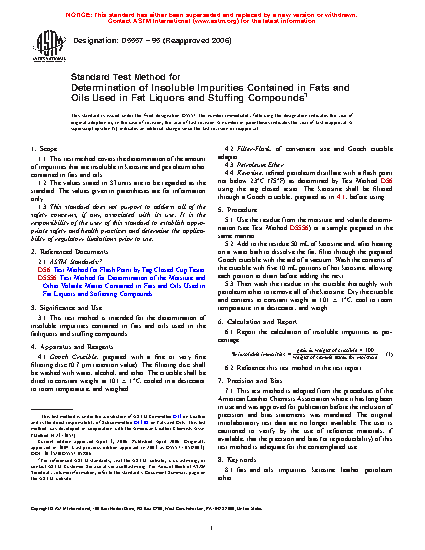 This test method is intended for the determination of insoluble impurities contained in fats and oils used in the fatliquors and stuffing compounds.