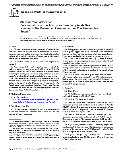 1.1 This test method covers determination of the acidity as free fatty acids in the presence of ammonium or triethanolamine soaps, or both, existing in a sample of sulfonated or sulfated oil, or both, by calculation from the total alkalinity and free-and-alkali combined fatty acids.