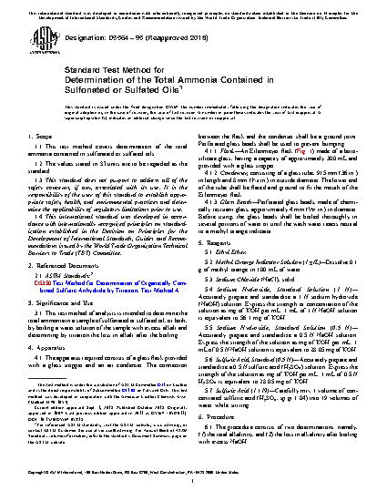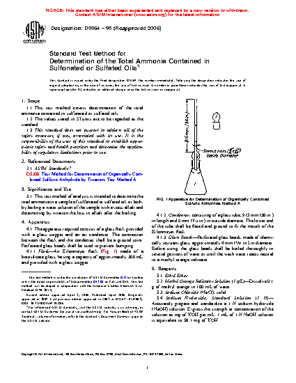 3.1 This test method of analysis is intended to determine the total ammonia in a sample of sulfonated or sulfated oil, or both, by boiling a water solution of the sample with excess alkali and determining by titration the loss in alkali after the boiling.