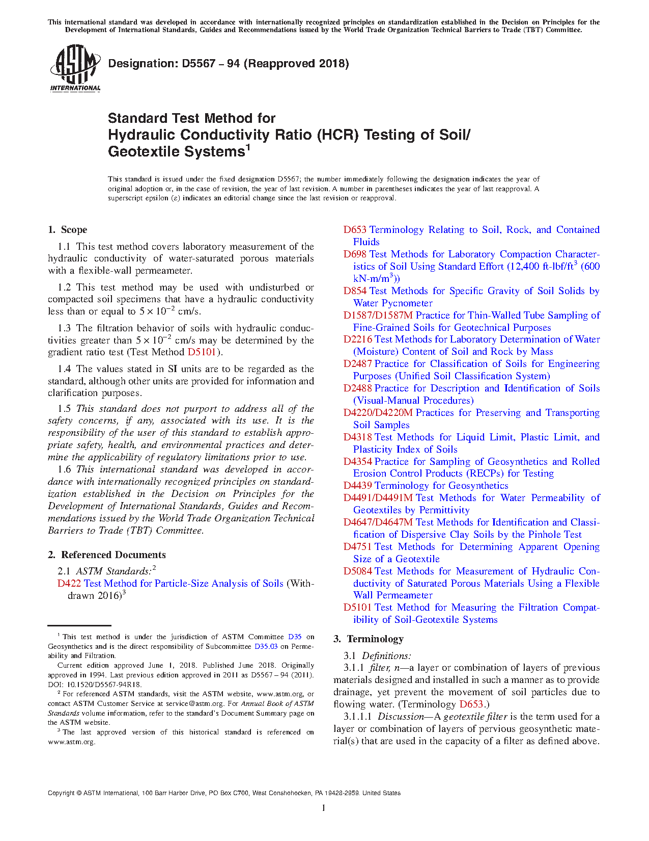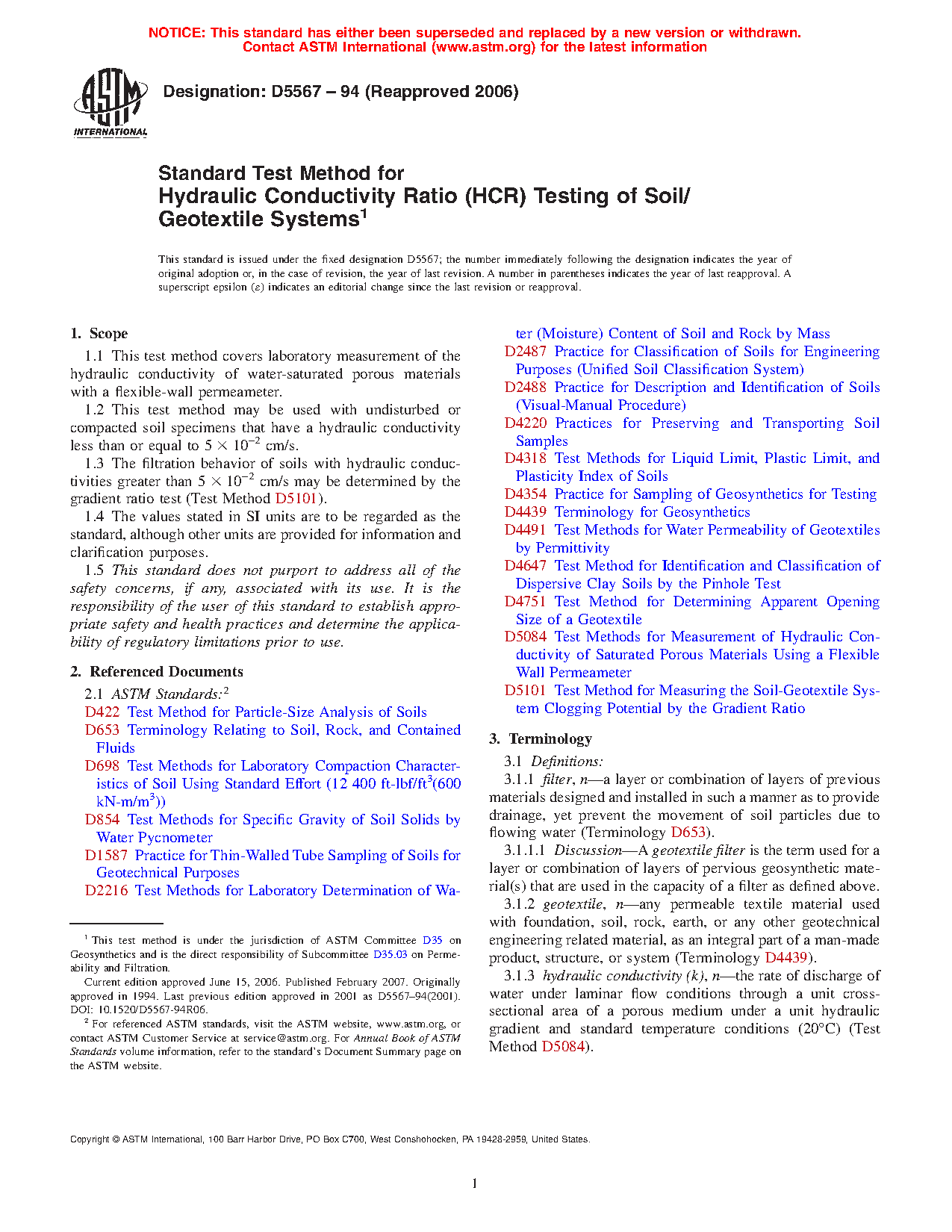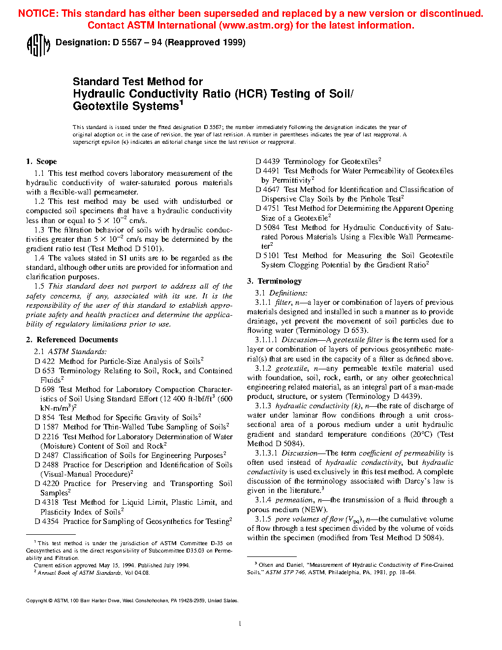 1.3 The filtration behavior of soils with hydraulic conductivities greater than 5 x 102 cm/s may be determined by the gradient ratio test (Test Method D 5101).