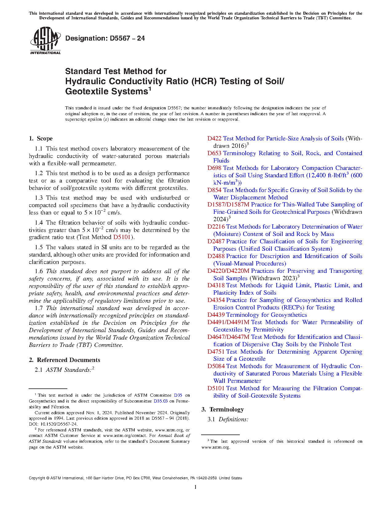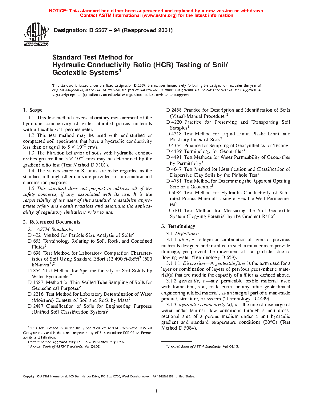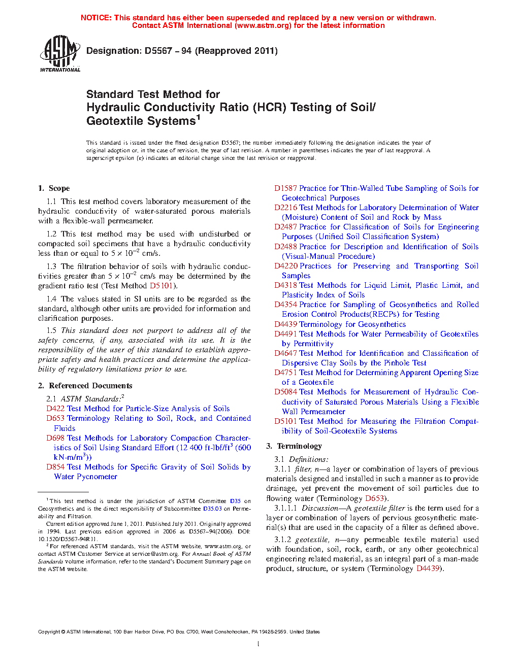 1.3 The filtration behavior of soils with hydraulic conductivities greater than 5 x 102 cm/s may be determined by the gradient ratio test (Test Method D 5101).