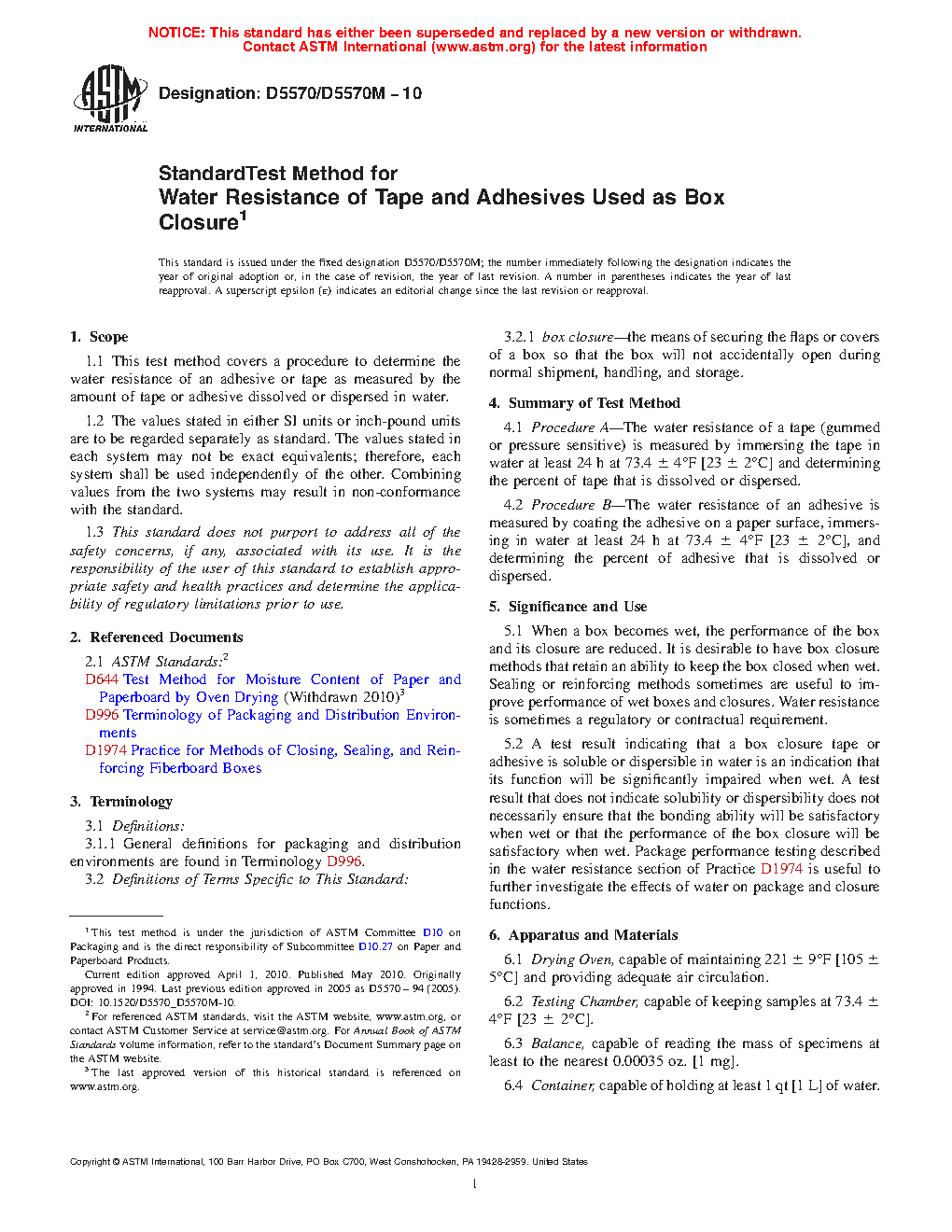 5.2 A test result indicating that a box closure tape or adhesive is soluble or dispersible in water is an indication that its function will be significantly impaired when wet. A test result that does not indicate solubility or dispersibility does not necessarily ensure that the bonding ability will be satisfactory when wet or that the performance of the box closure will be satisfactory when wet. Package performance testing described in the water resistance section of Practice D1974 is useful to further investigate the effects of water on package and closure functions.