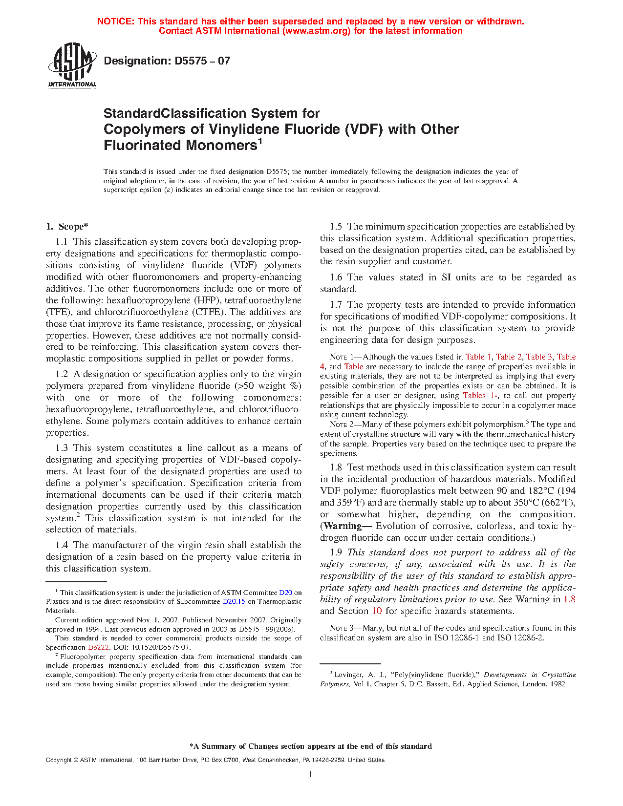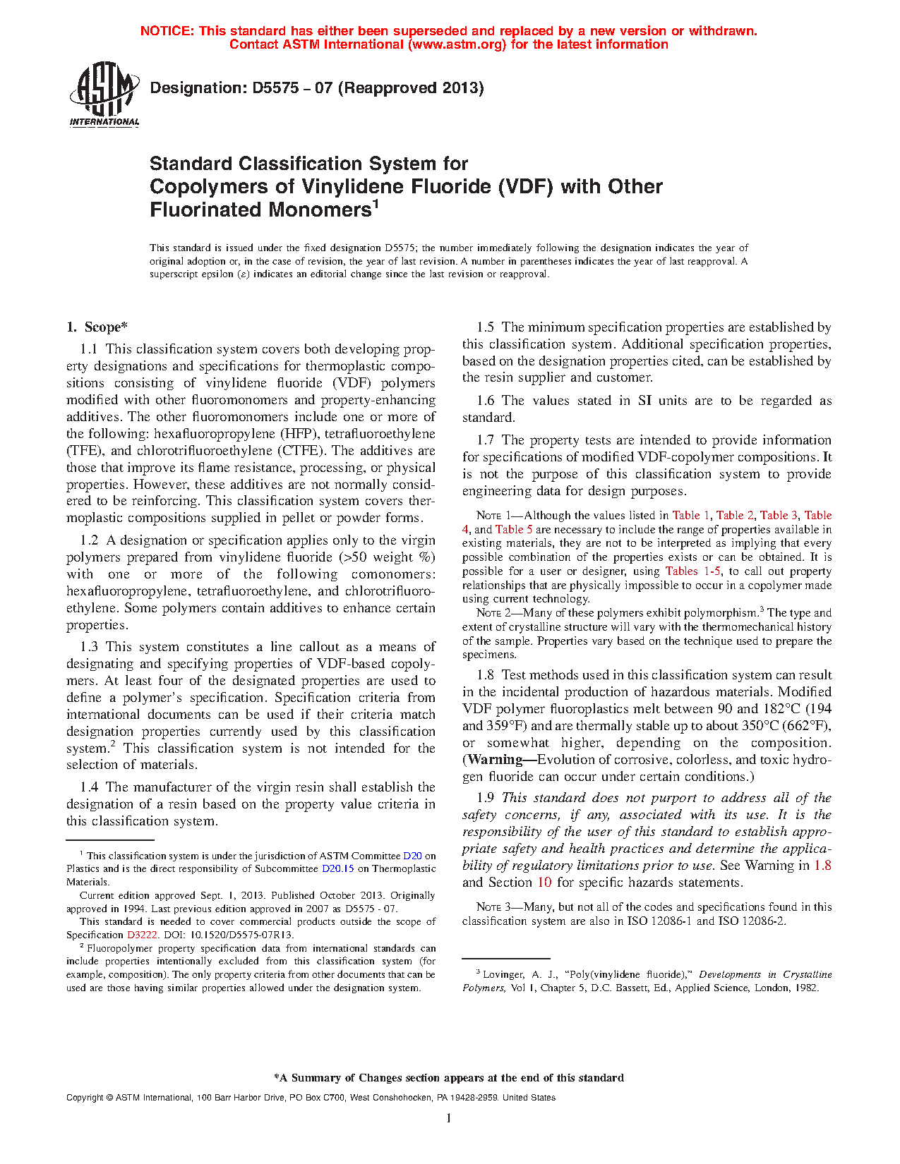 1.3 This system constitutes a line callout as a means of designating and specifying properties of VDF-based copolymers. At least four of the designated properties are used to define a polymer's specification. Specification criteria from international documents can be used if their criteria match designation properties currently used by this classification system.2 This classification system is not intended for the selection of materials.