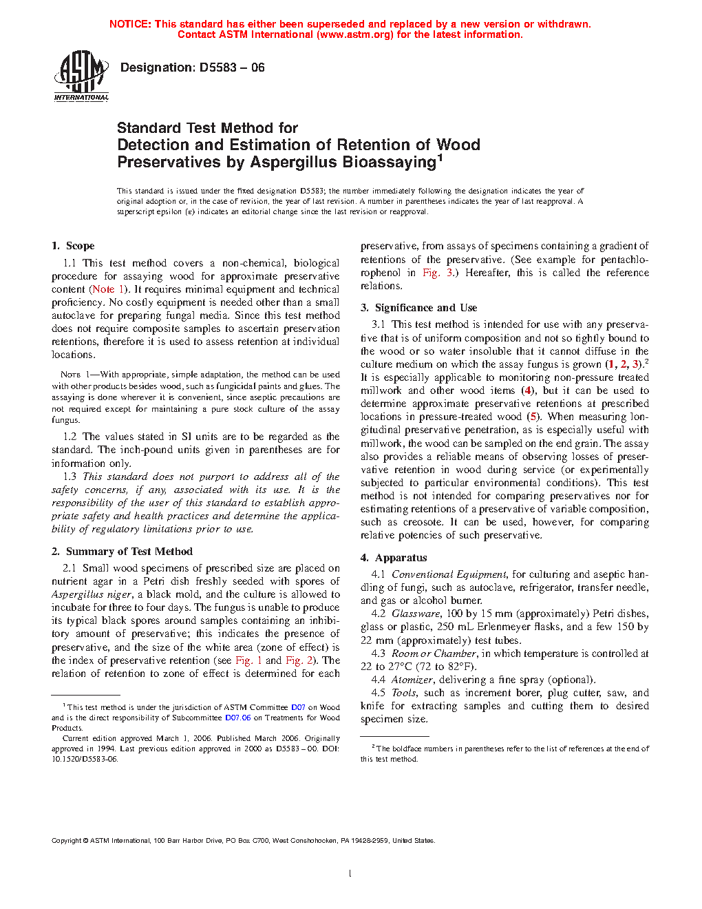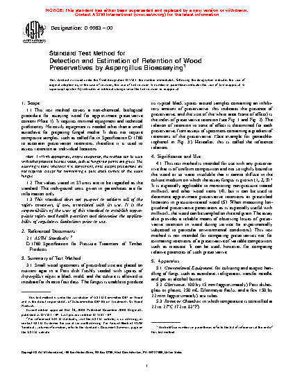 1.1 This test method covers a non-chemical, biological procedure for assaying wood for approximate preservative content (Note 1). It requires minimal equipment and technical proficiency. No costly equipment is needed other than a small autoclave for preparing fungal media. It does not require composite samples, such as called for in Specification D1760 to ascertain preservation retentions, therefore it is used to assess retention at individual locations.